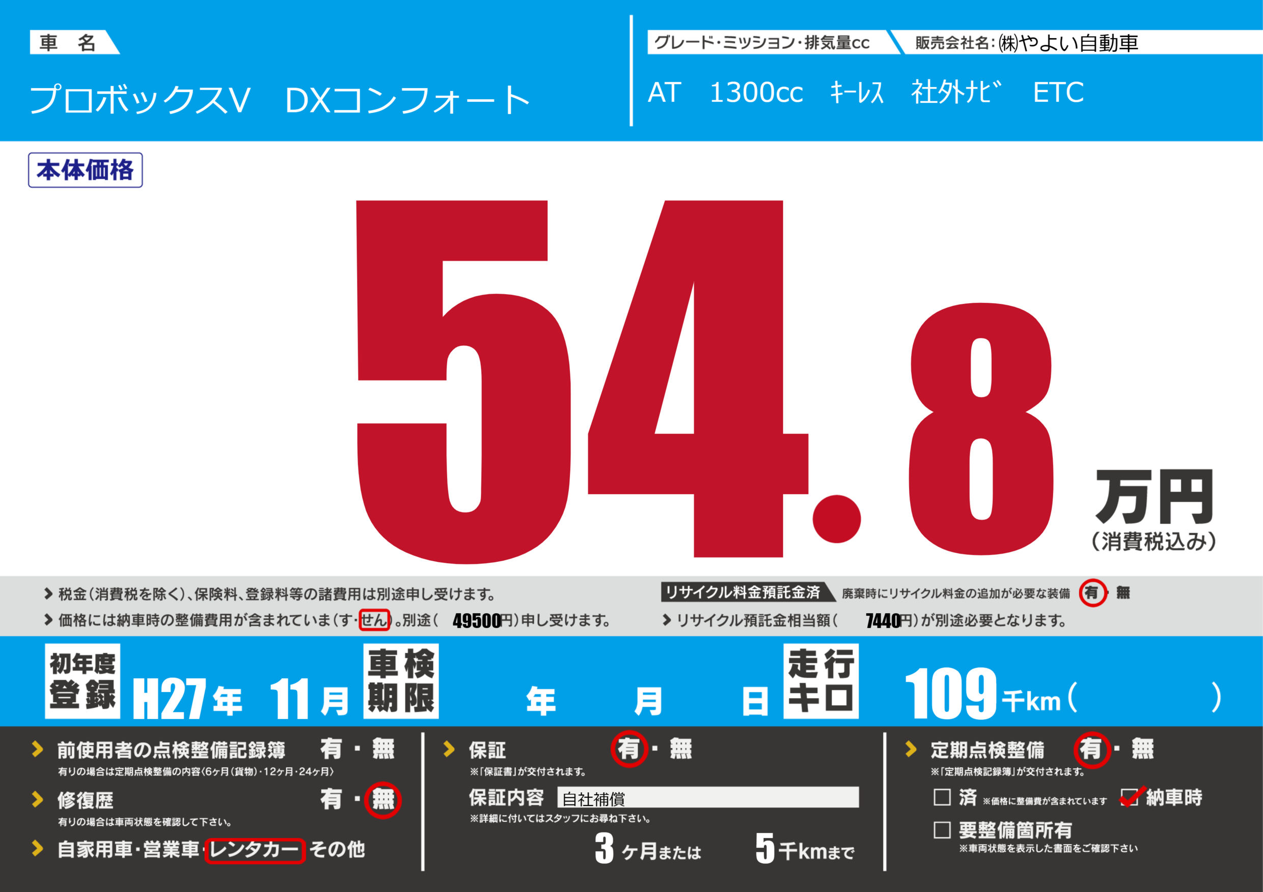 | 車名 | プロボックスV DXコンフォート | グレード ミッション 排気量 |