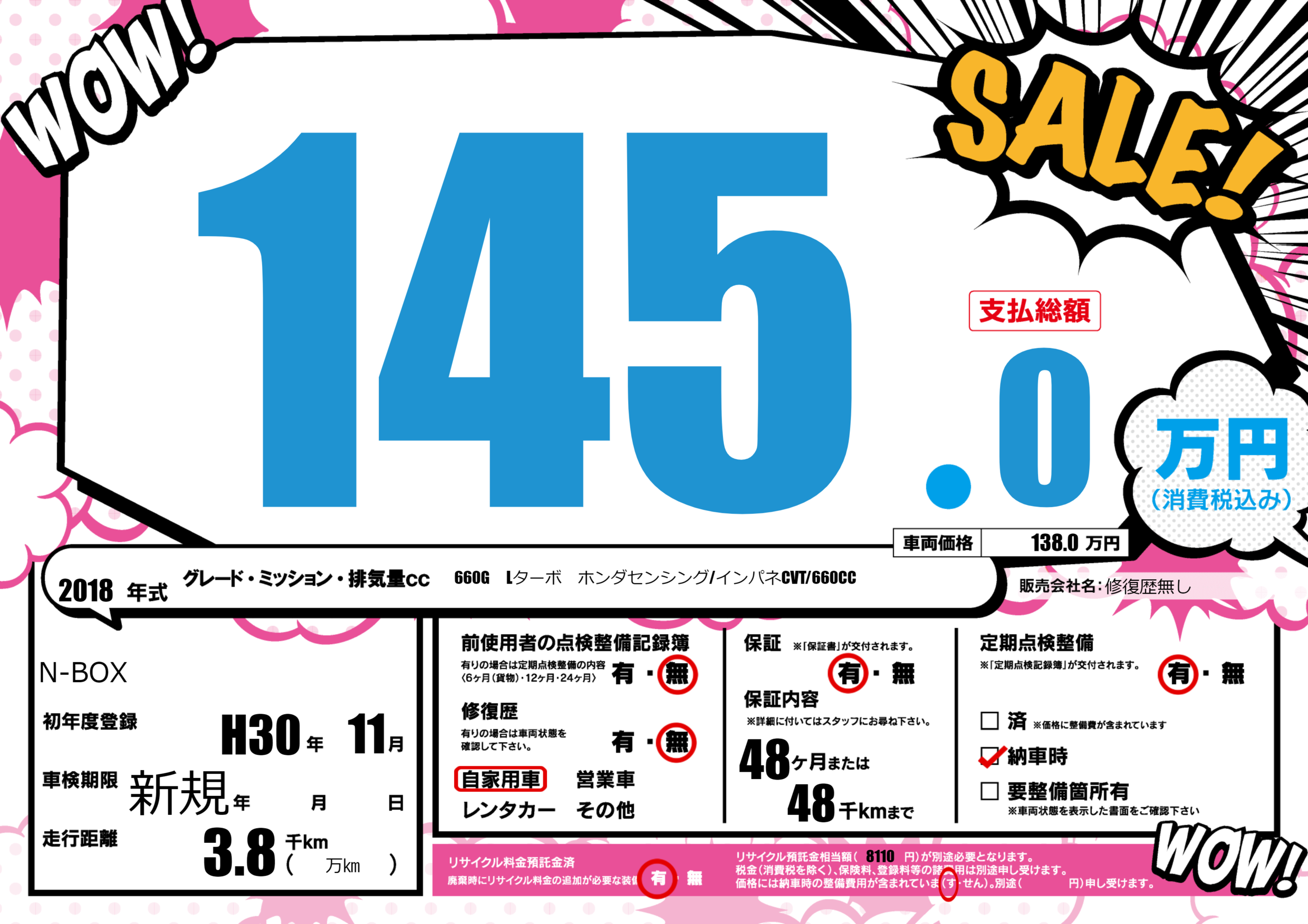 | 走行キロ | 0.3万km | 初年度登録 | H30年11月 |