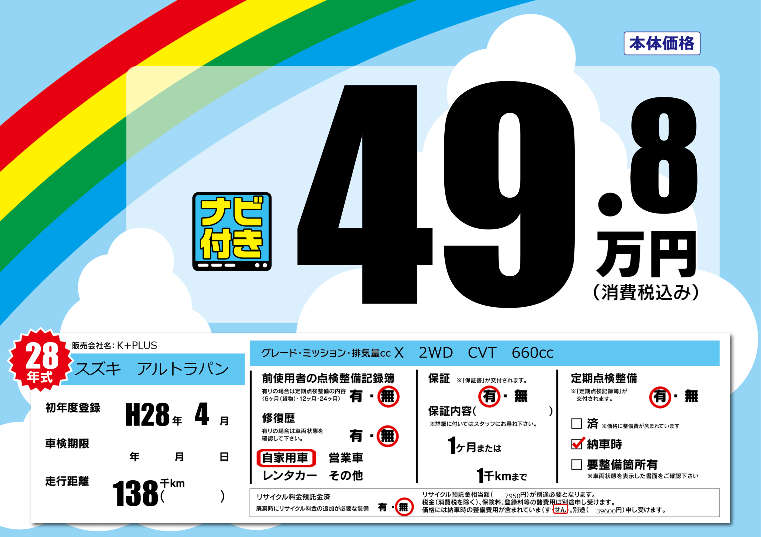 | 走行キロ | 13.8万km | 初年度登録 | H28年4月 |