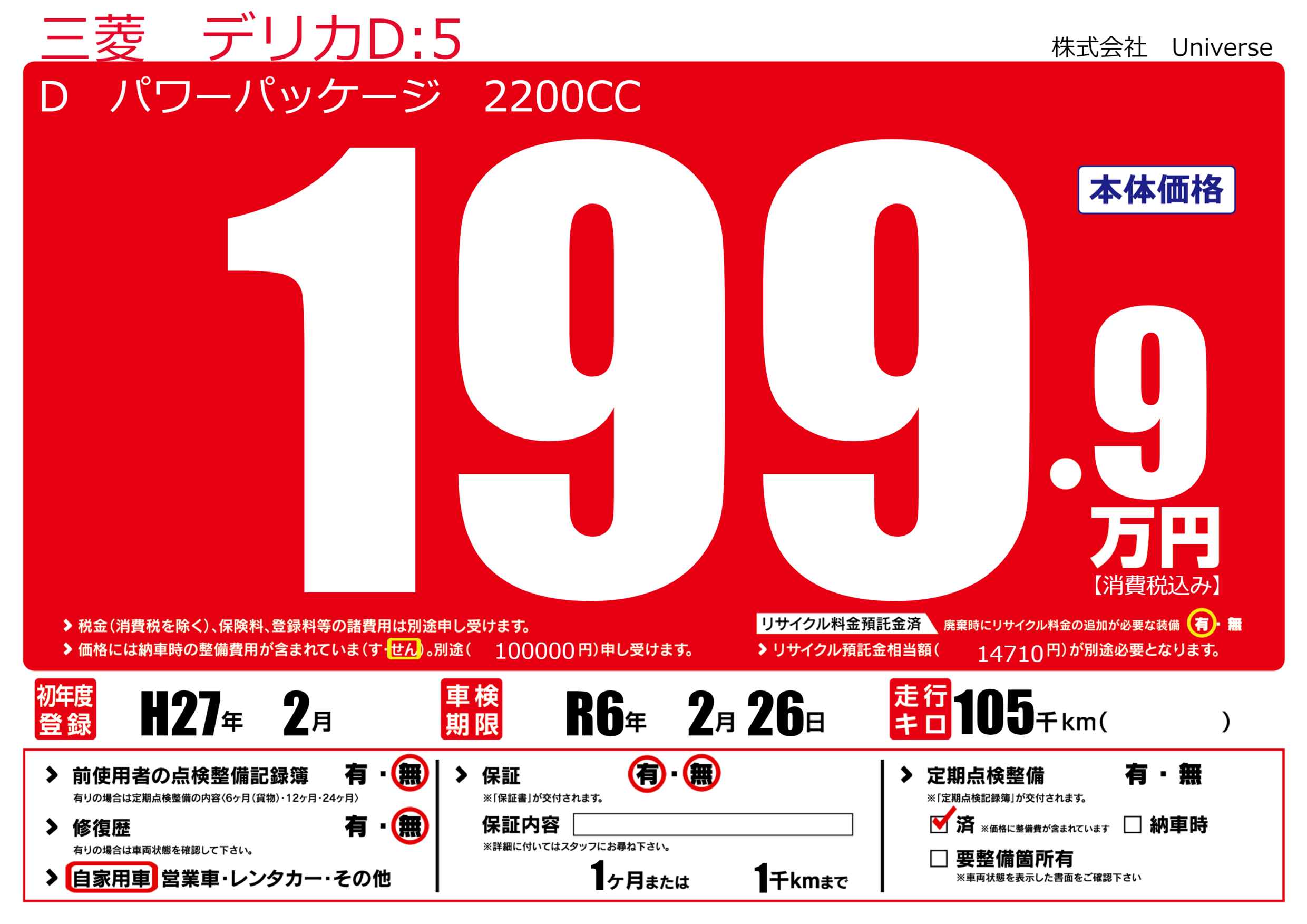 | 車名 | 三菱 デリカD:5 | グレード ミッション 排気量 |