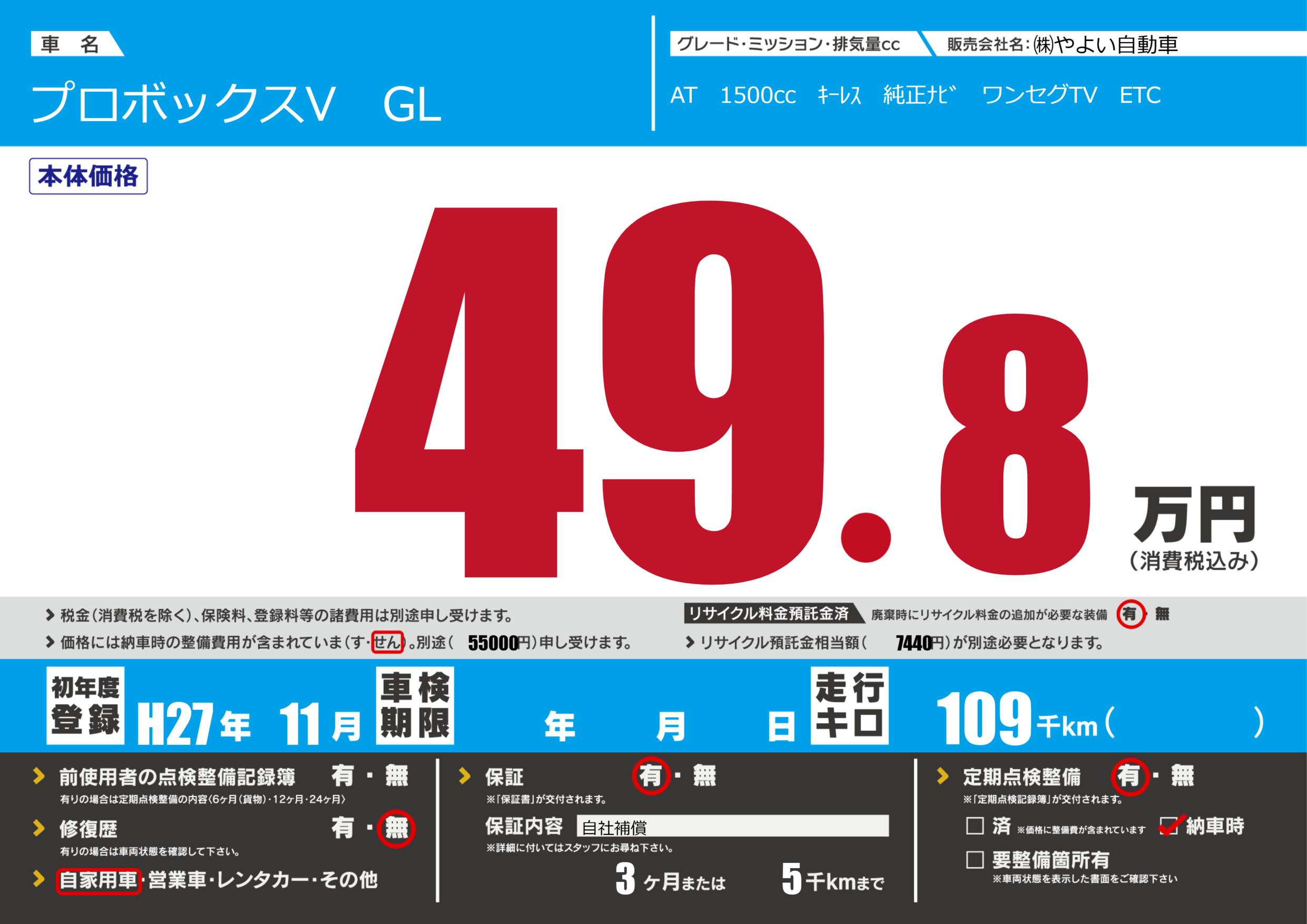 | 車名 | プロボックスV GL | グレード ミッション 排気量 |