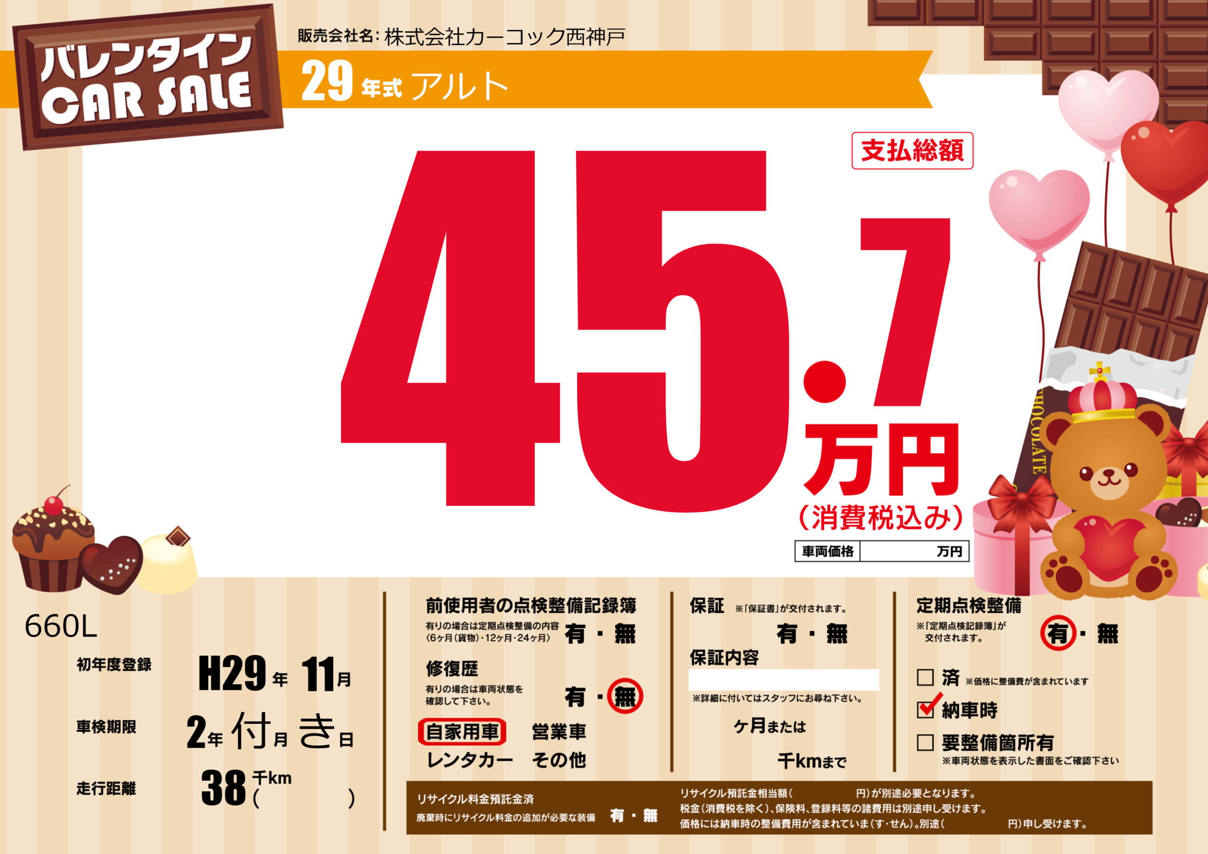 | 定期点検整備 | 定期点検整備あり 納車時あり | ||
