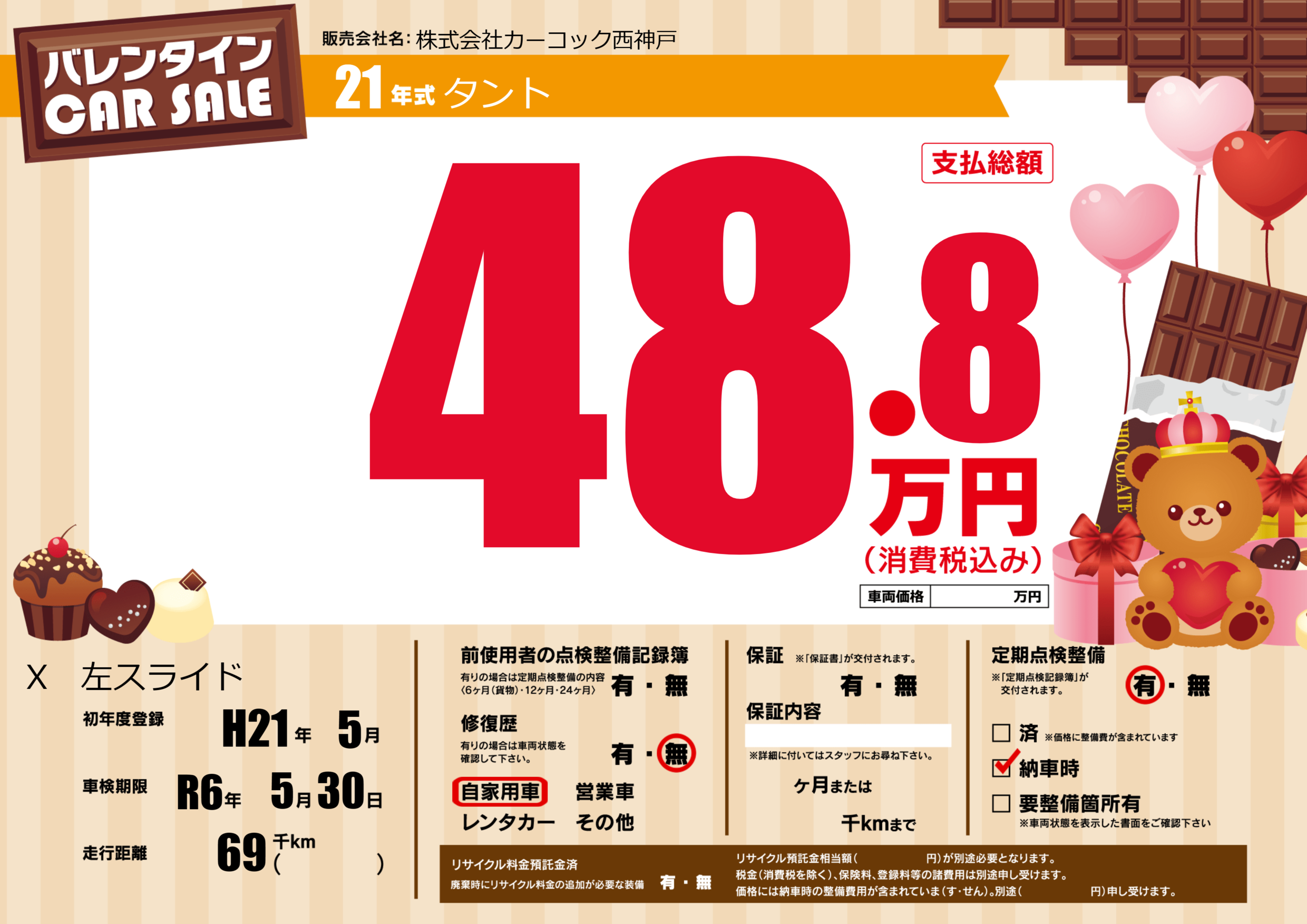 | 走行キロ | 6.9万km | 初年度登録 | H21年5月 |