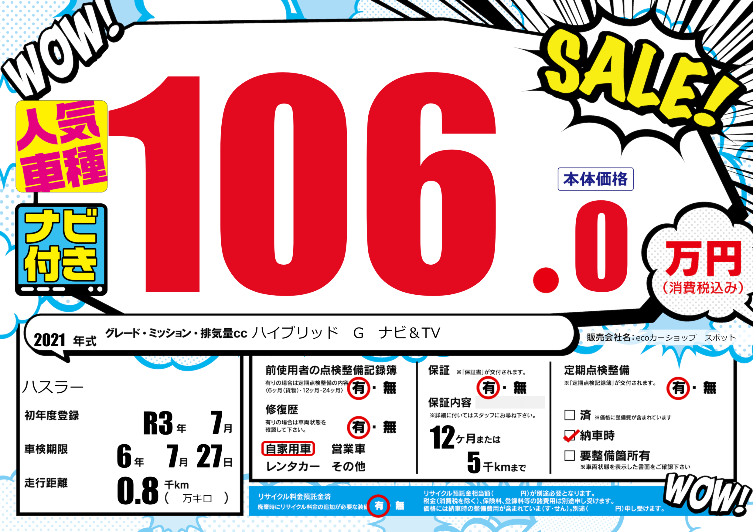 | 車名 | ハスラー | グレード ミッション 排気量 |
