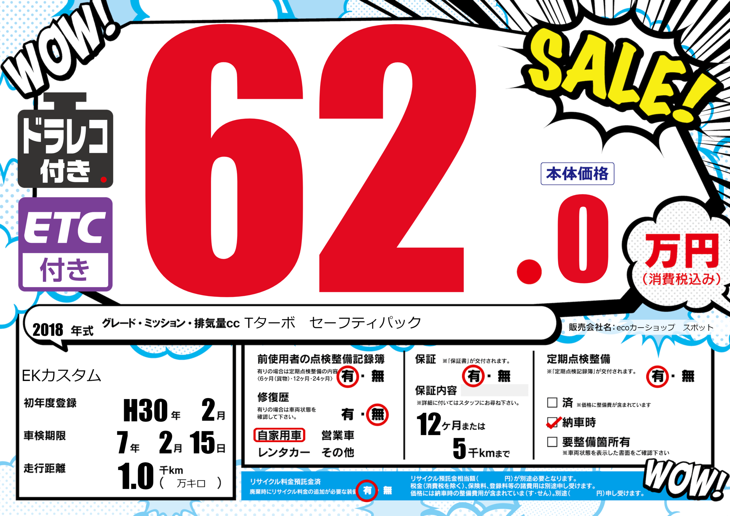 | 走行キロ | 0.1万km | 初年度登録 | H30年2月 |