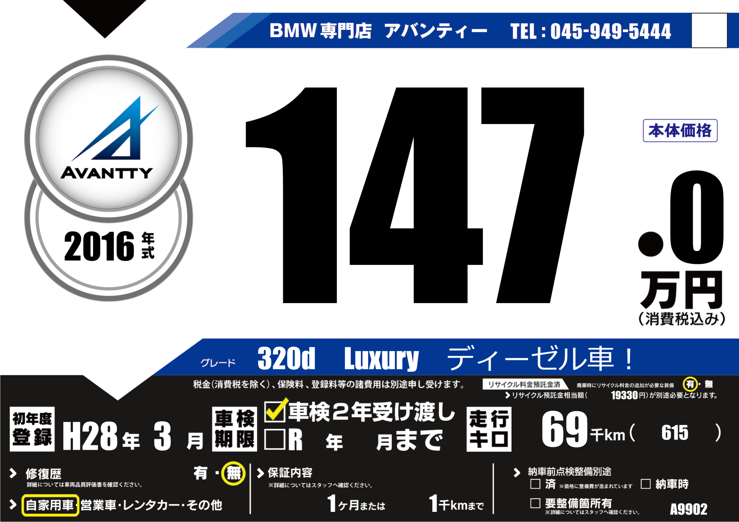 | 走行キロ | 6.9万km | 初年度登録 | H28年3月 |