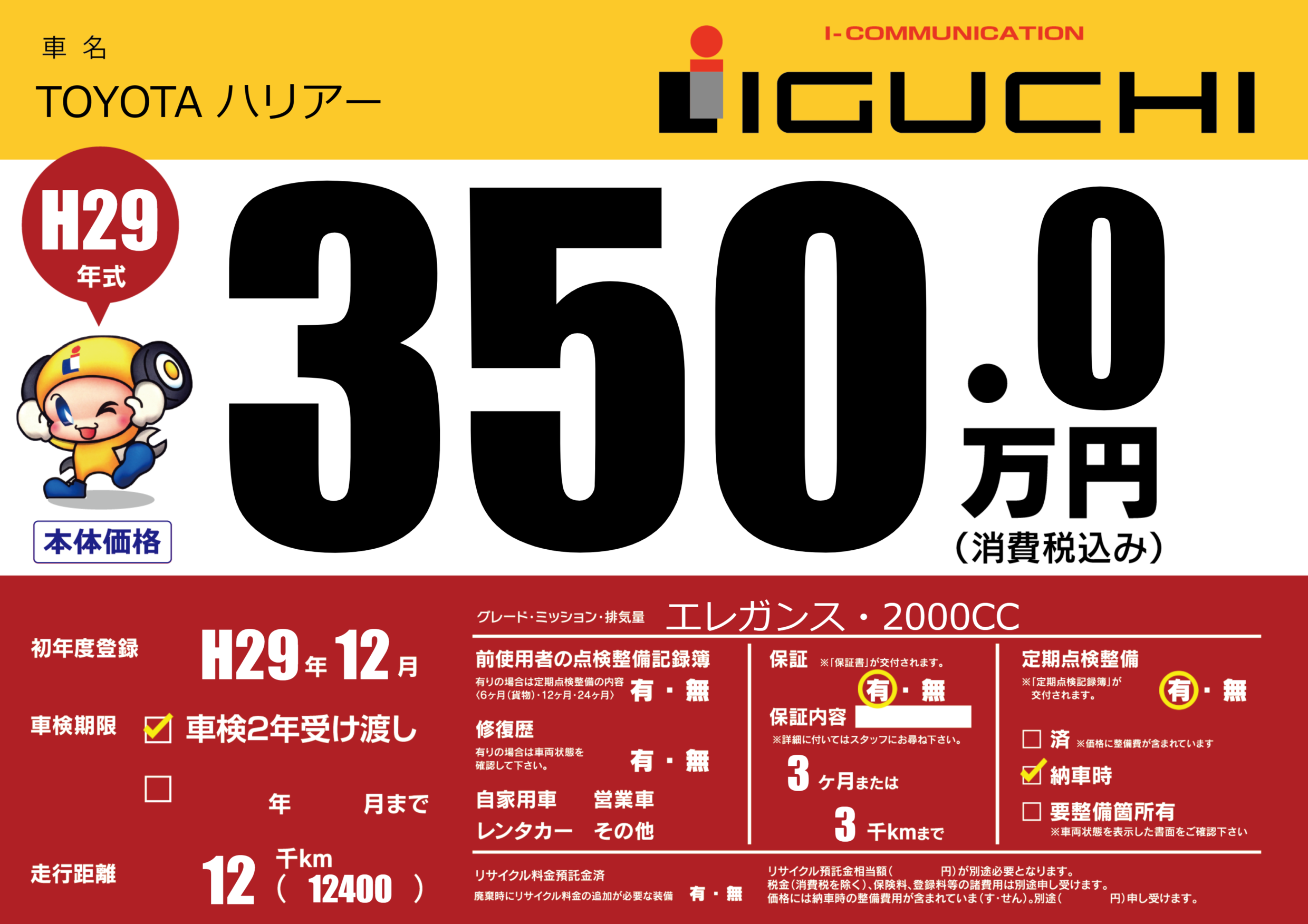 | 走行キロ | 1.2万km | 初年度登録 | H29年12月 |