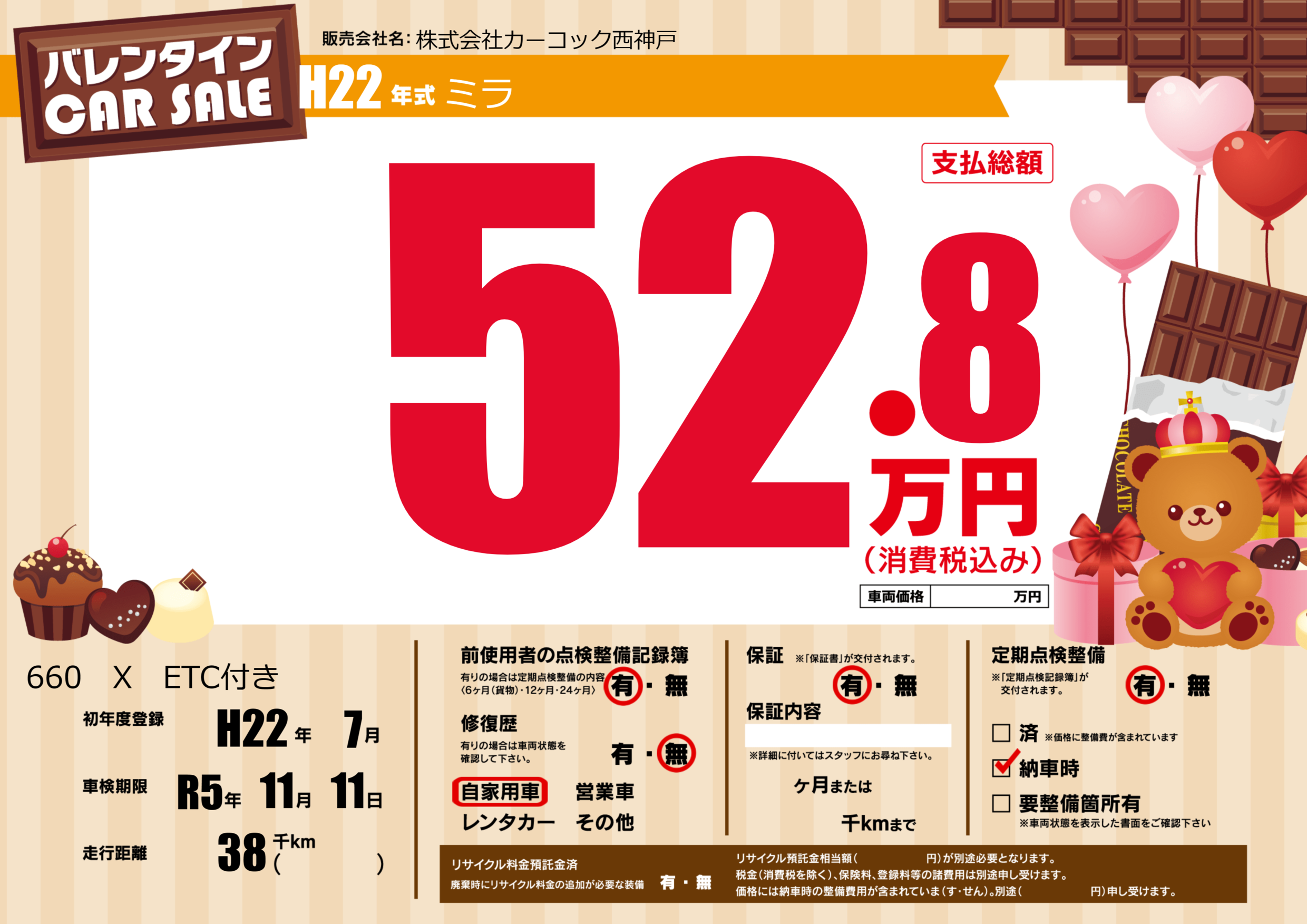 | 走行キロ | 3.8万km | 初年度登録 | H22年7月 |