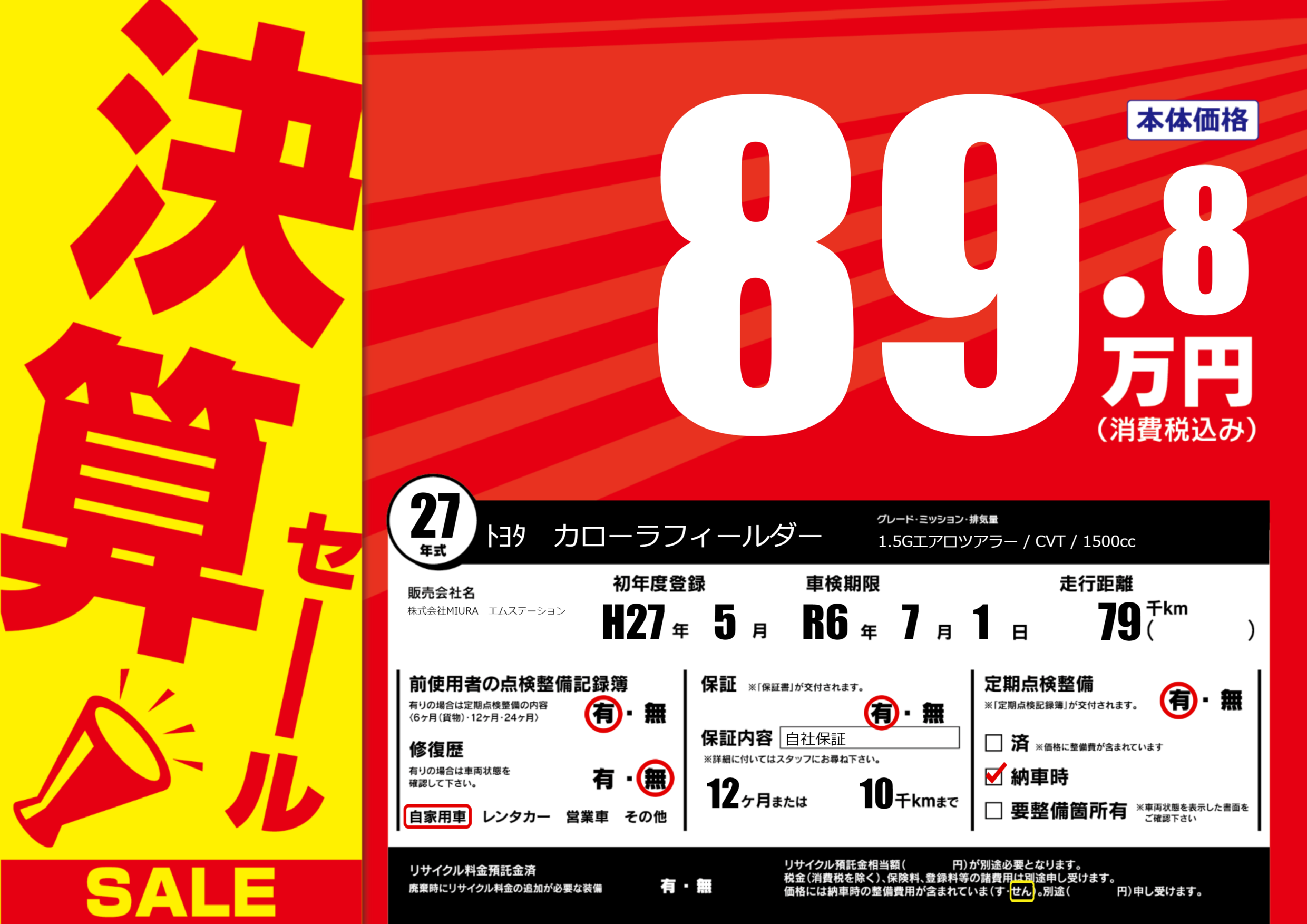 保証付き 保証内容(自社保証) 12ヶ月または(10)千kmまで |
