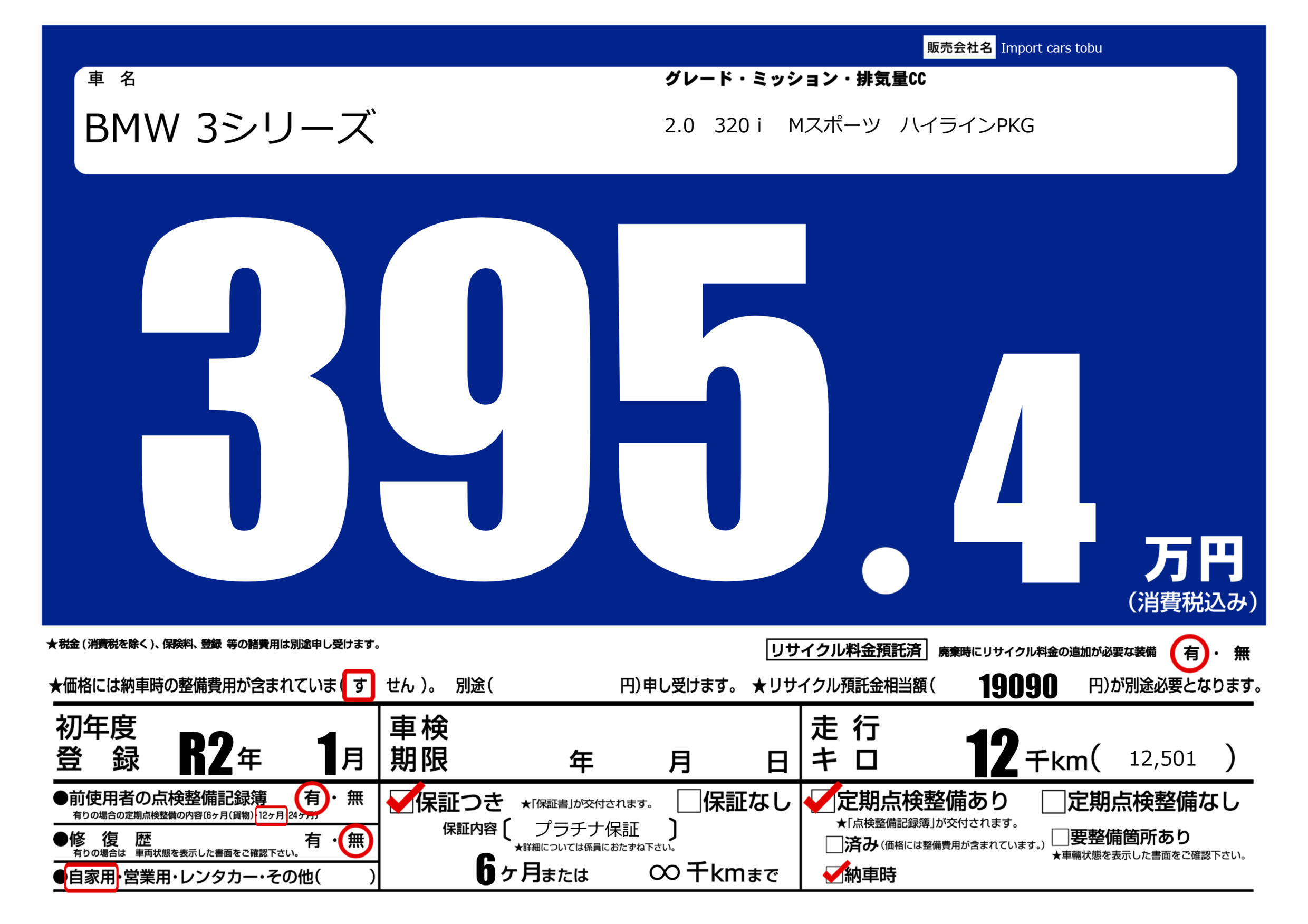 | 車名 | BMW 3シリーズ | グレード ミッション 排気量 |
