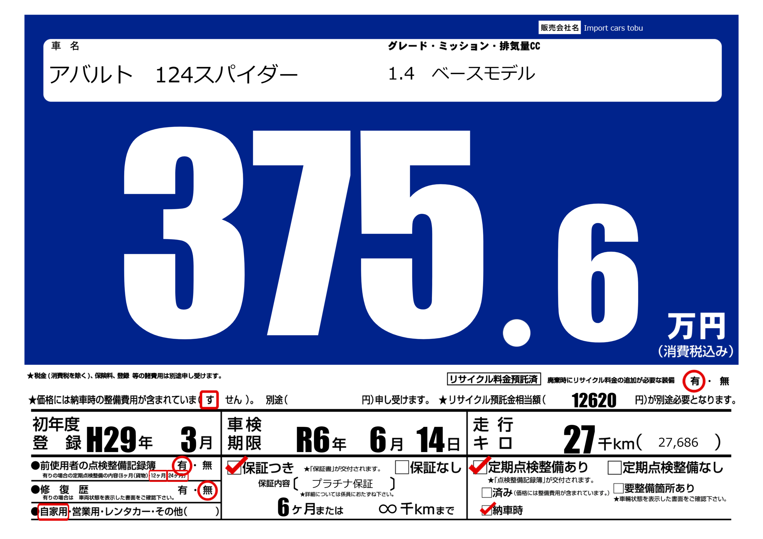 保証付き 保証内容( プラチナ保証) 6ヶ月または(∞)千kmまで |