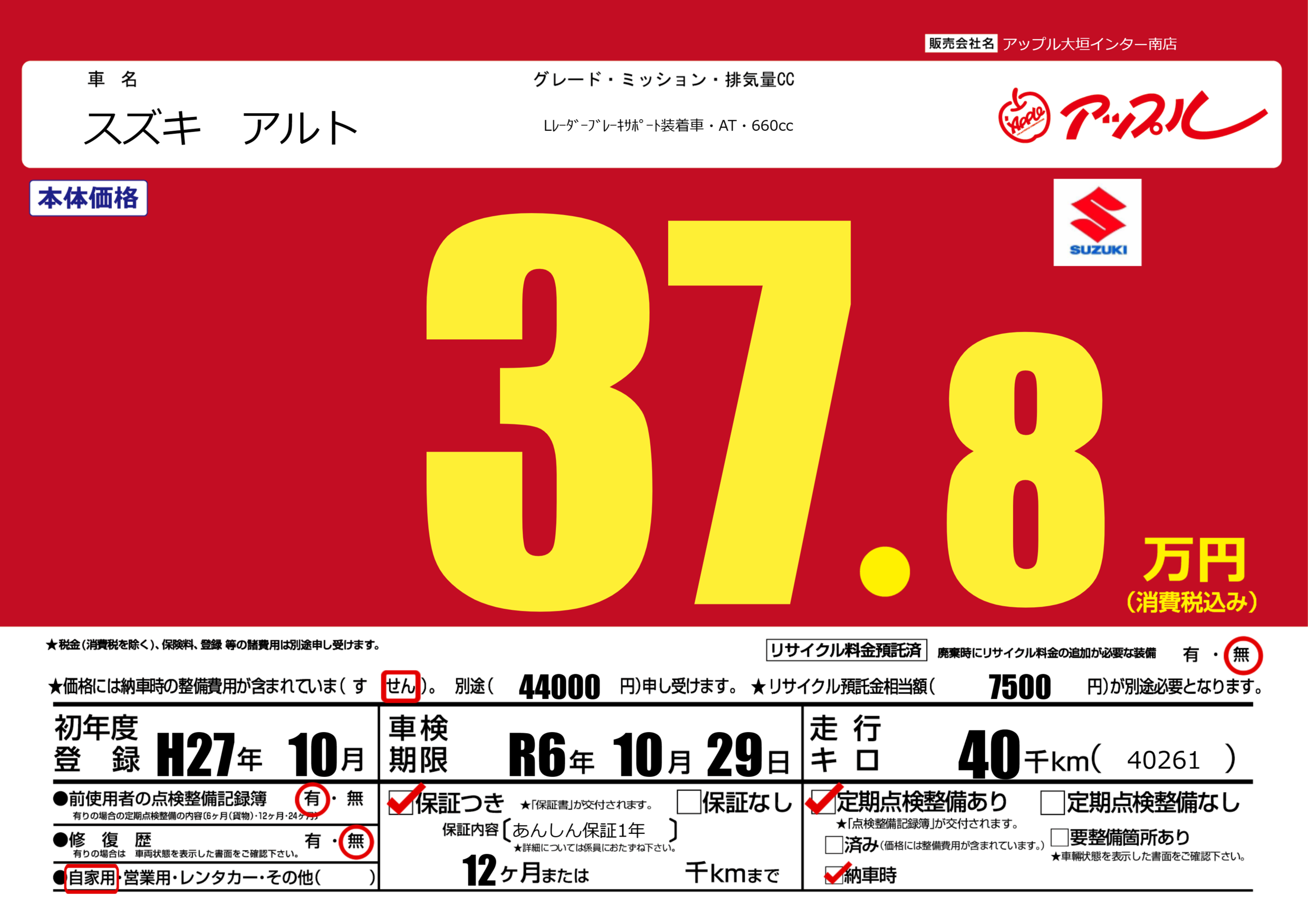 | 車名 | スズキ アルト | グレード ミッション 排気量 |