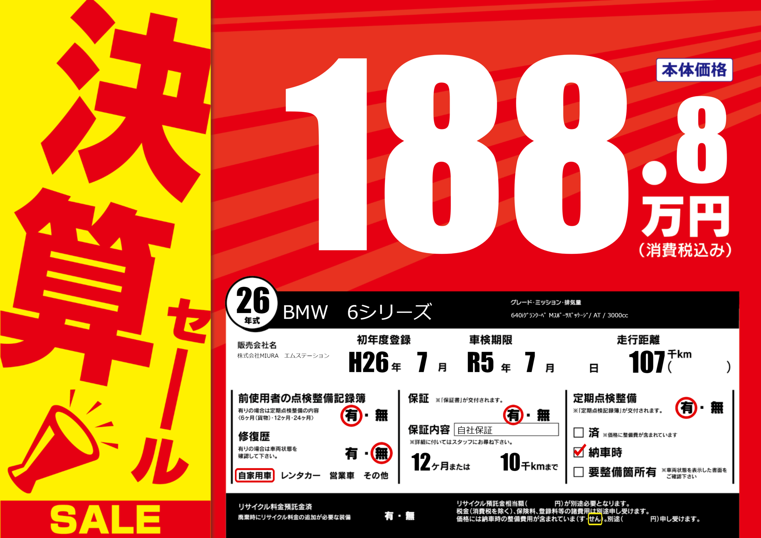 | 車名 | BMW 6シリーズ | グレード ミッション 排気量 |