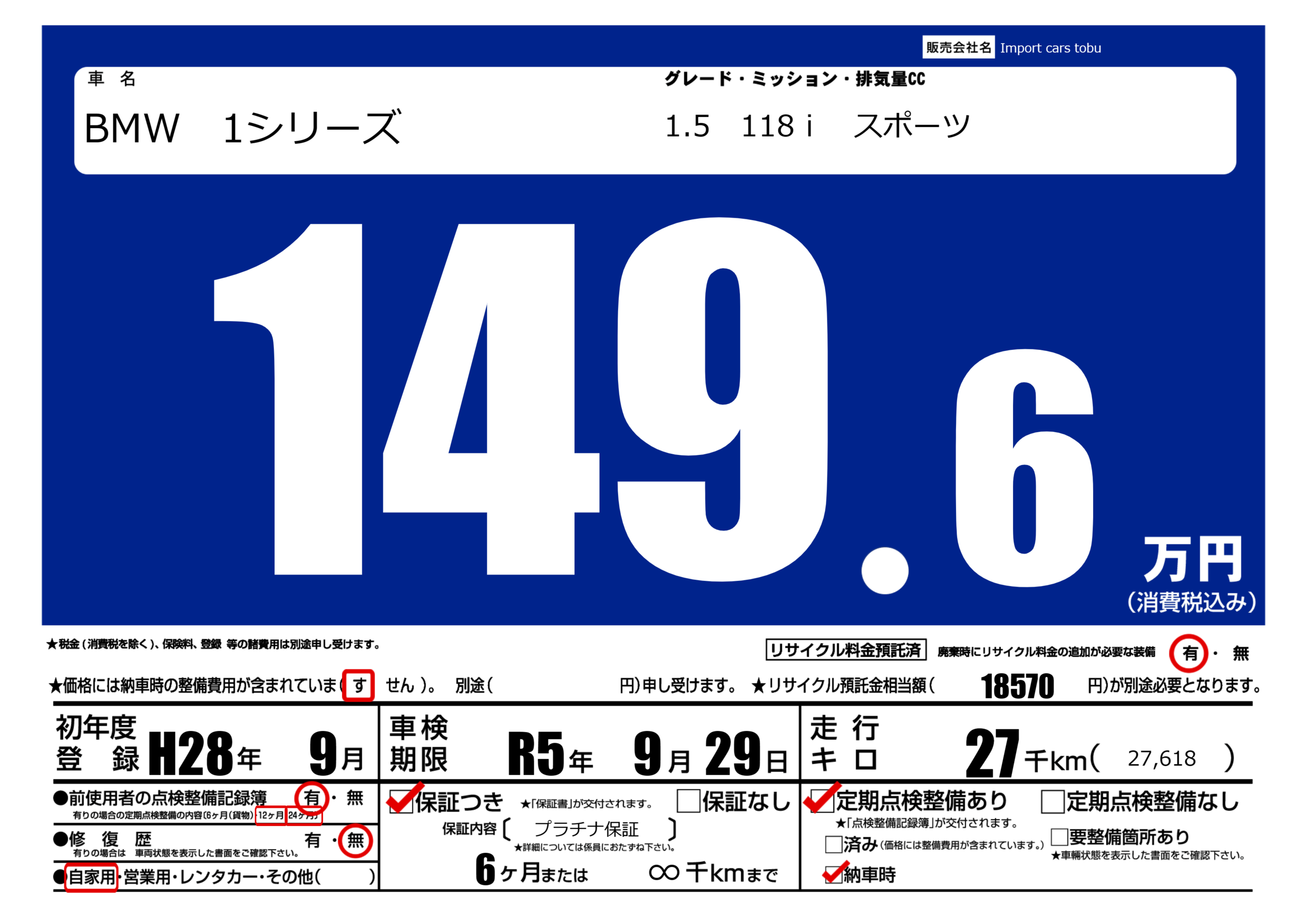 保証付き 保証内容( プラチナ保証) 6ヶ月または(∞)千kmまで |