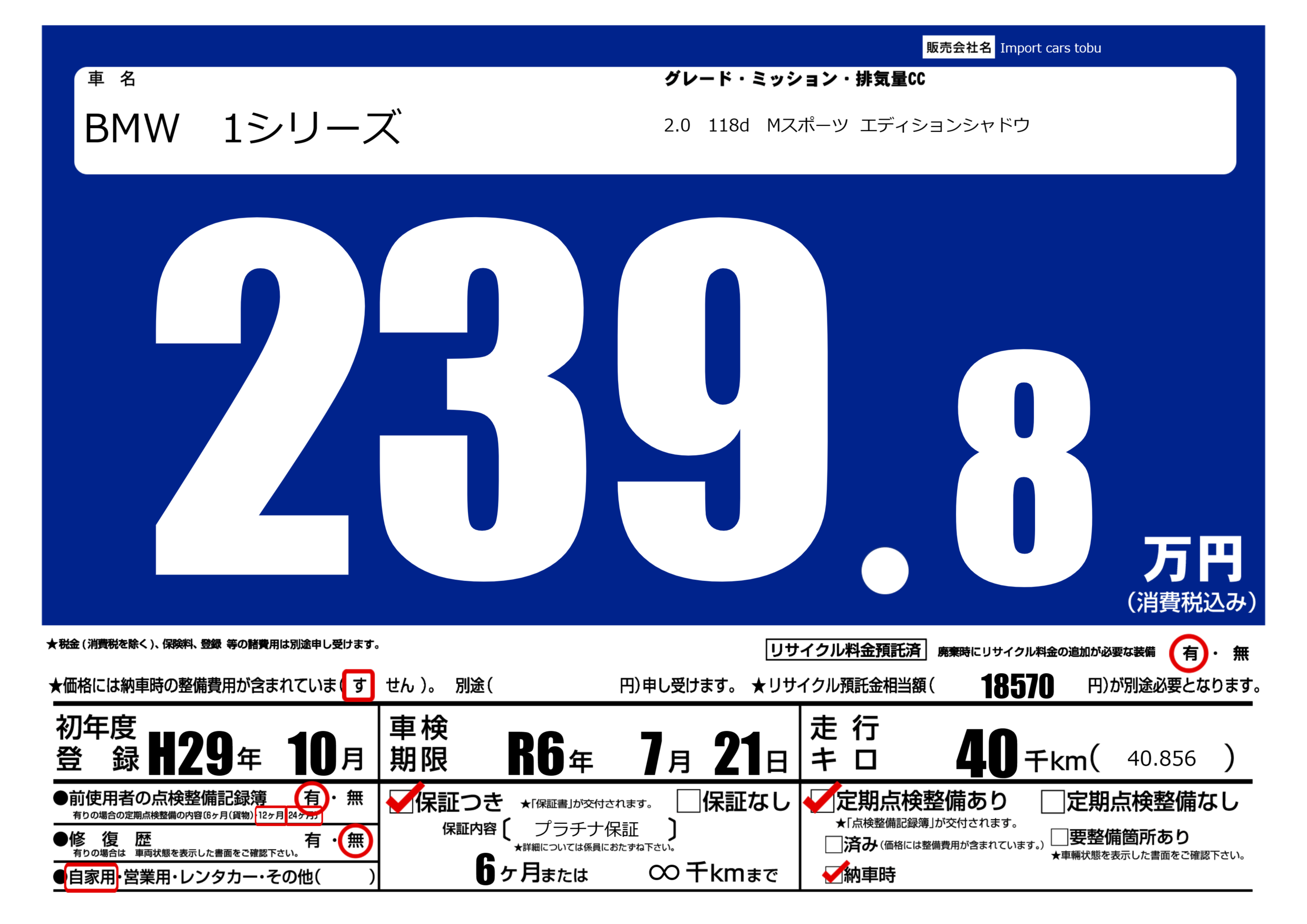 | 定期点検整備 | 定期点検整備あり 納車時あり | ||