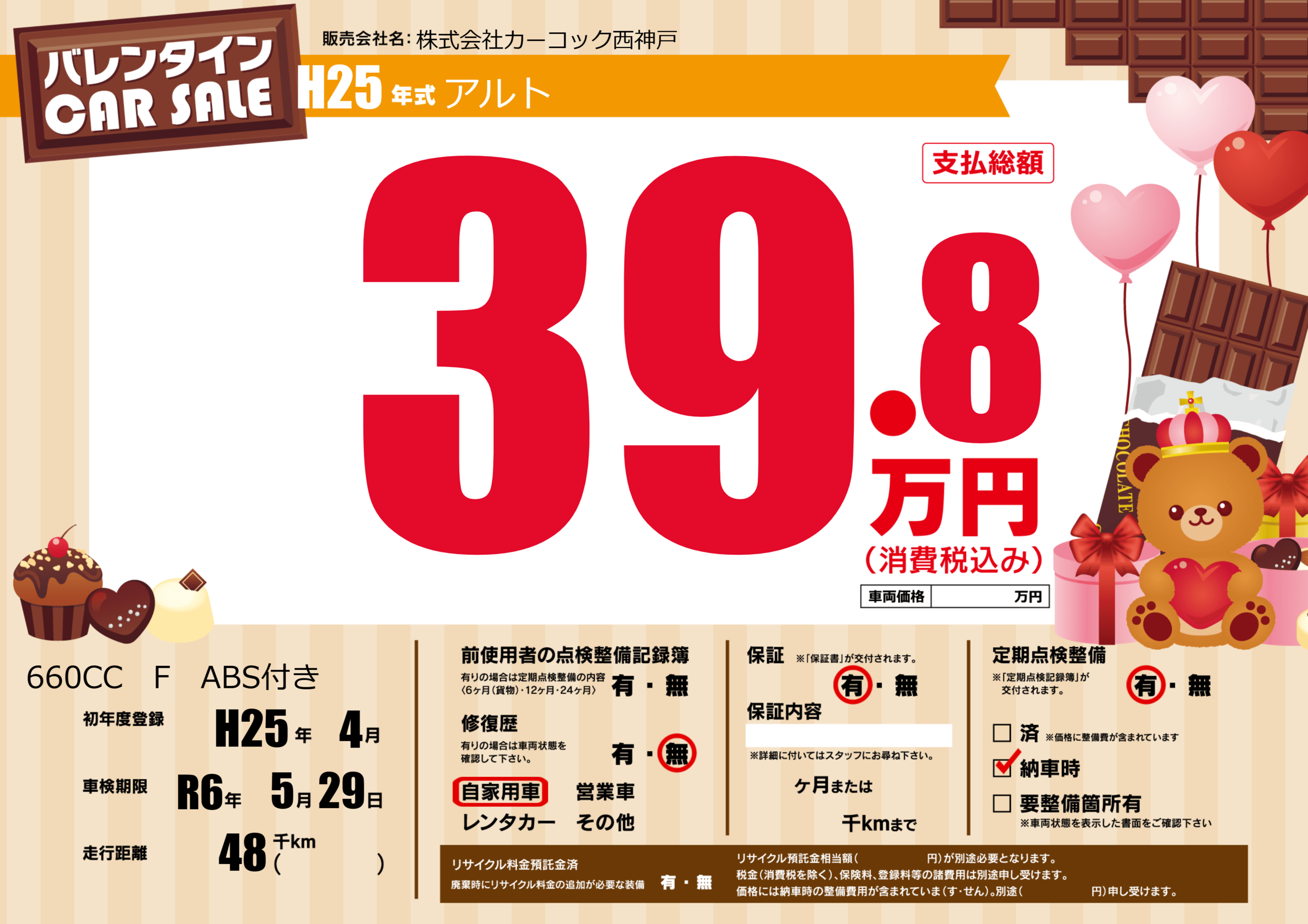 | 定期点検整備 | 定期点検整備あり 納車時あり | ||