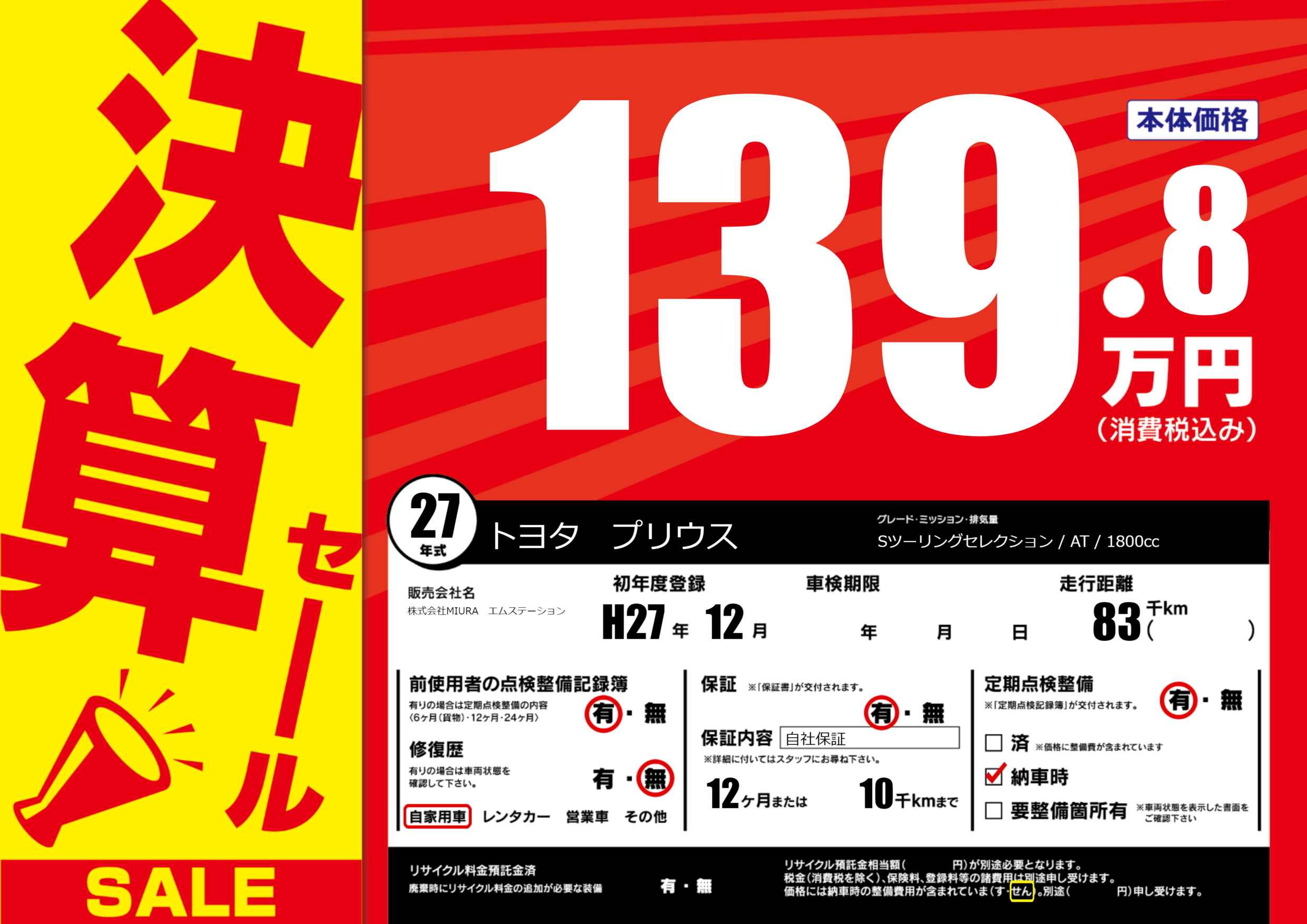 保証付き 保証内容(自社保証) 12ヶ月または(10)千kmまで |
