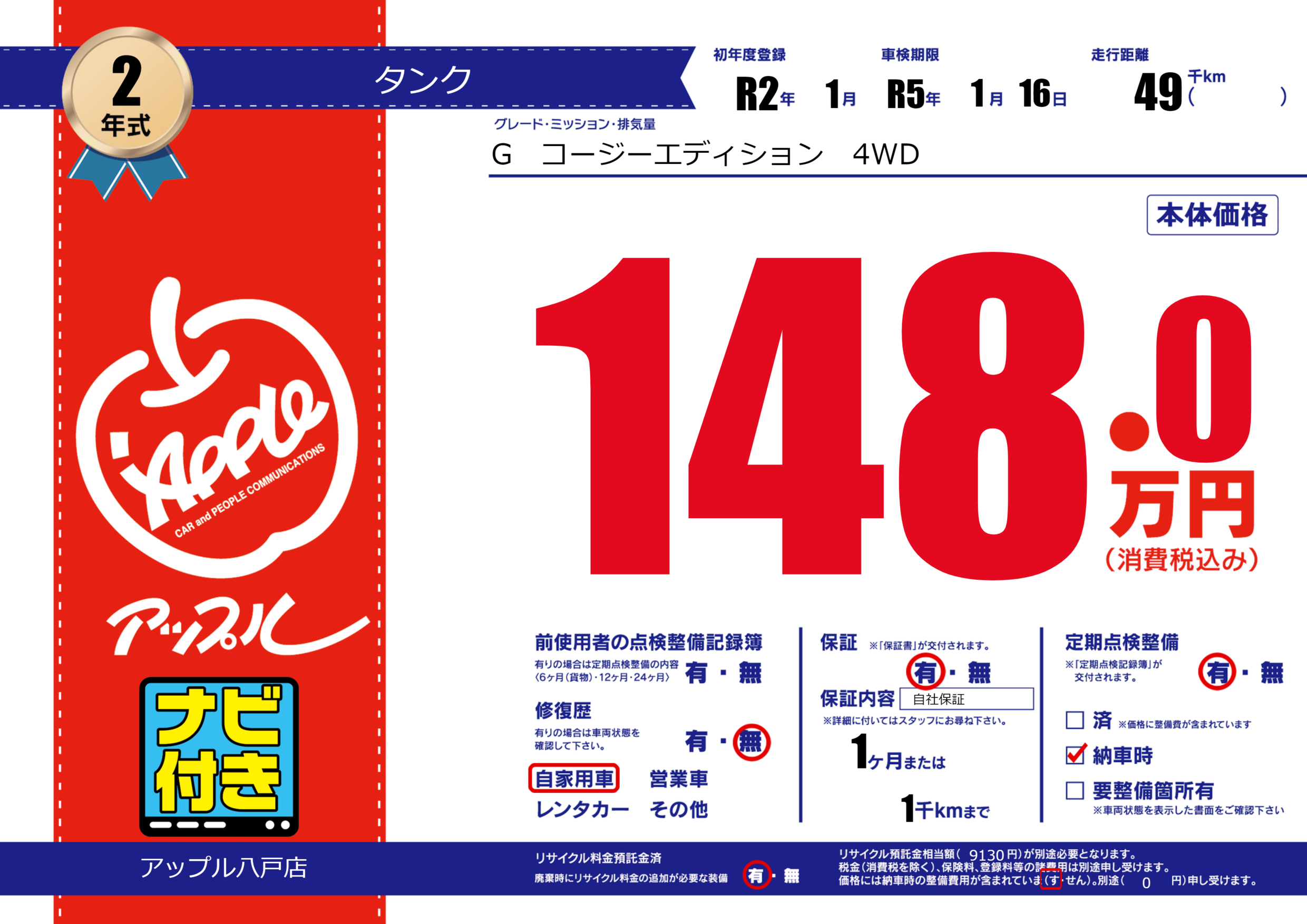 | 走行キロ | 4.9万km | 初年度登録 | R2年1月 |