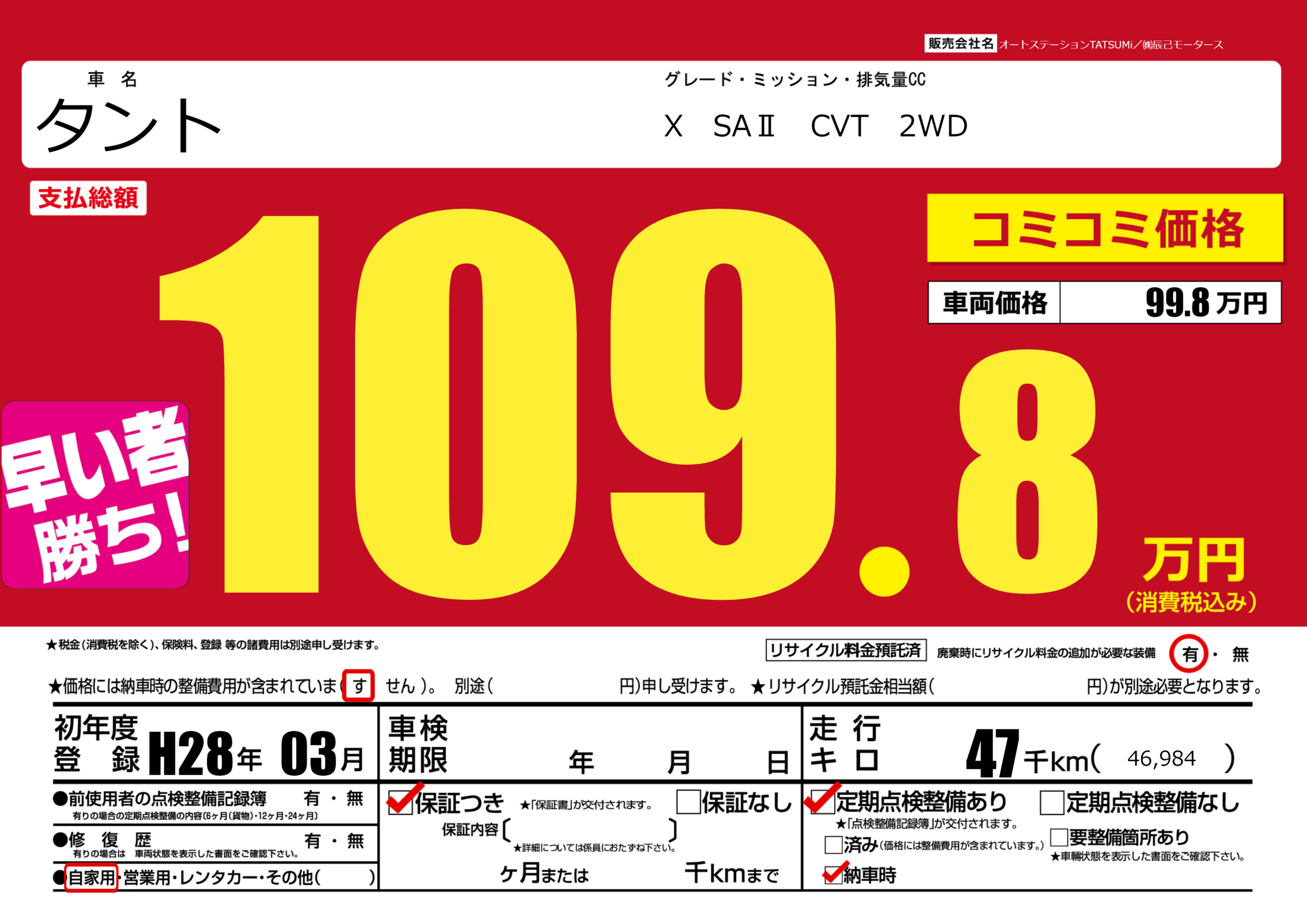 | 走行キロ | 4.7万km | 初年度登録 | H28年03月 |