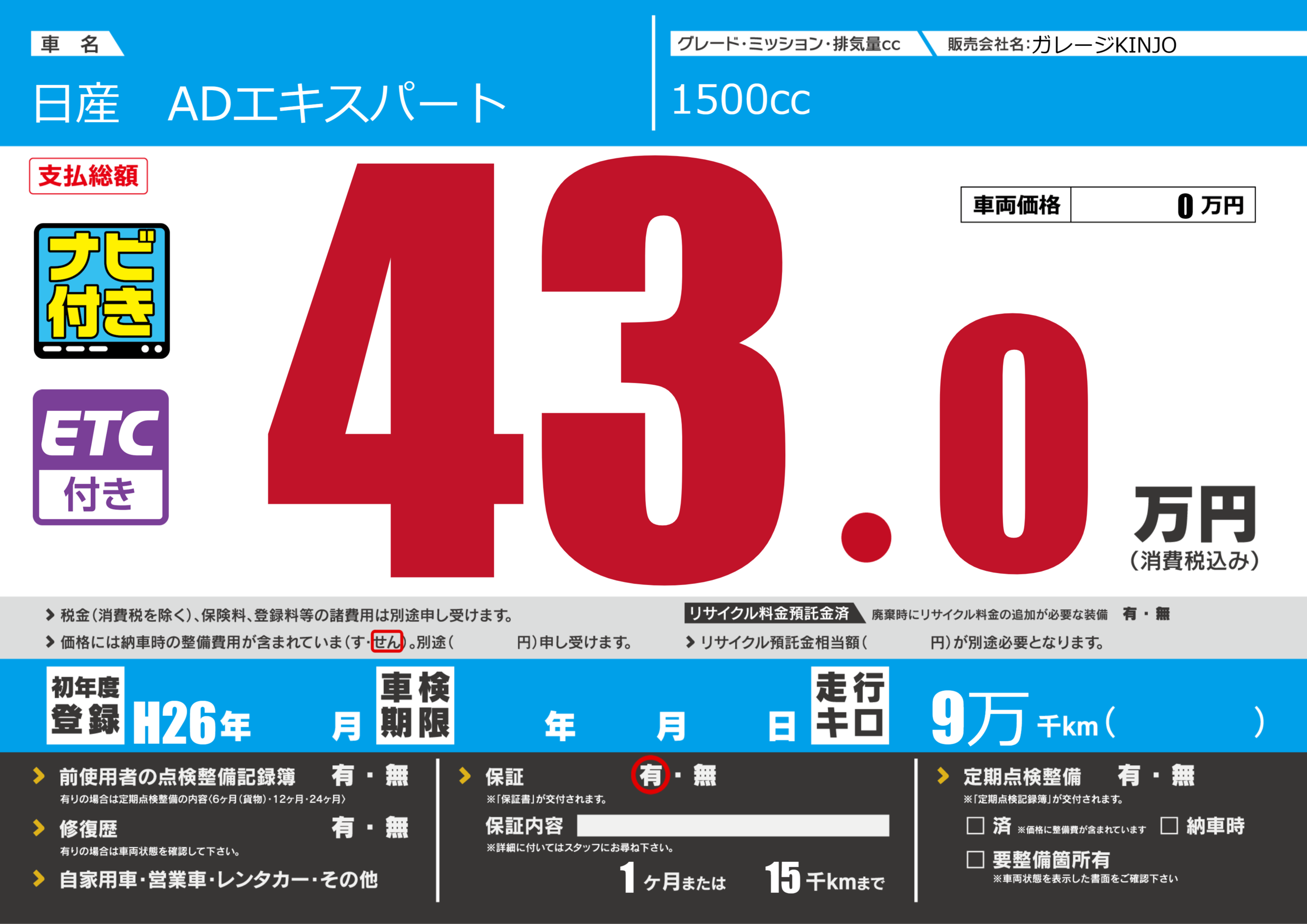 保証付き 保証内容(---) 1ヶ月または(15)千kmまで |