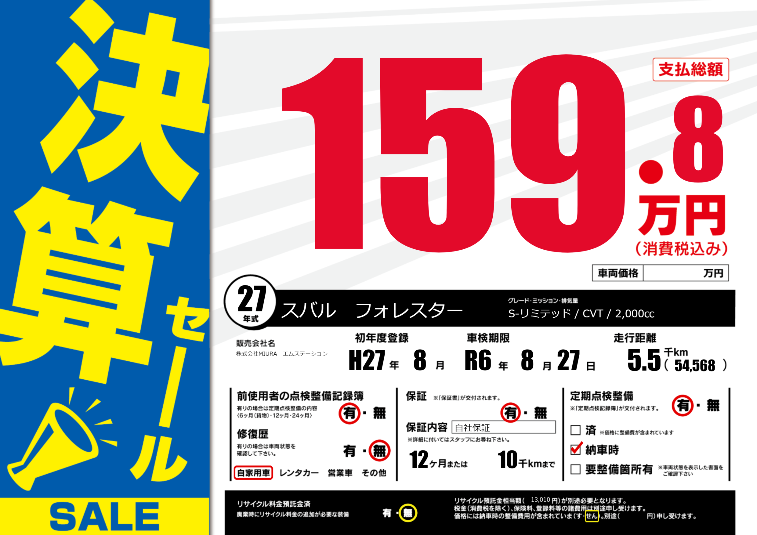 | 車名 | スバル フォレスター | グレード ミッション 排気量 |
