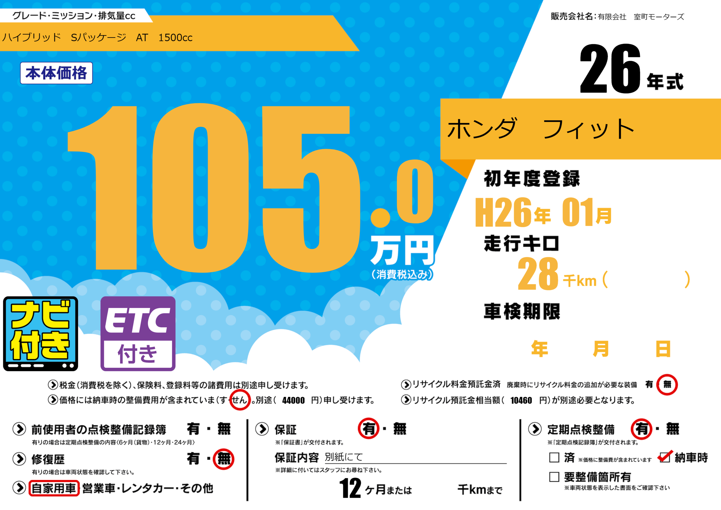 保証付き 保証内容(別紙にて) 12ヶ月または()千kmまで |