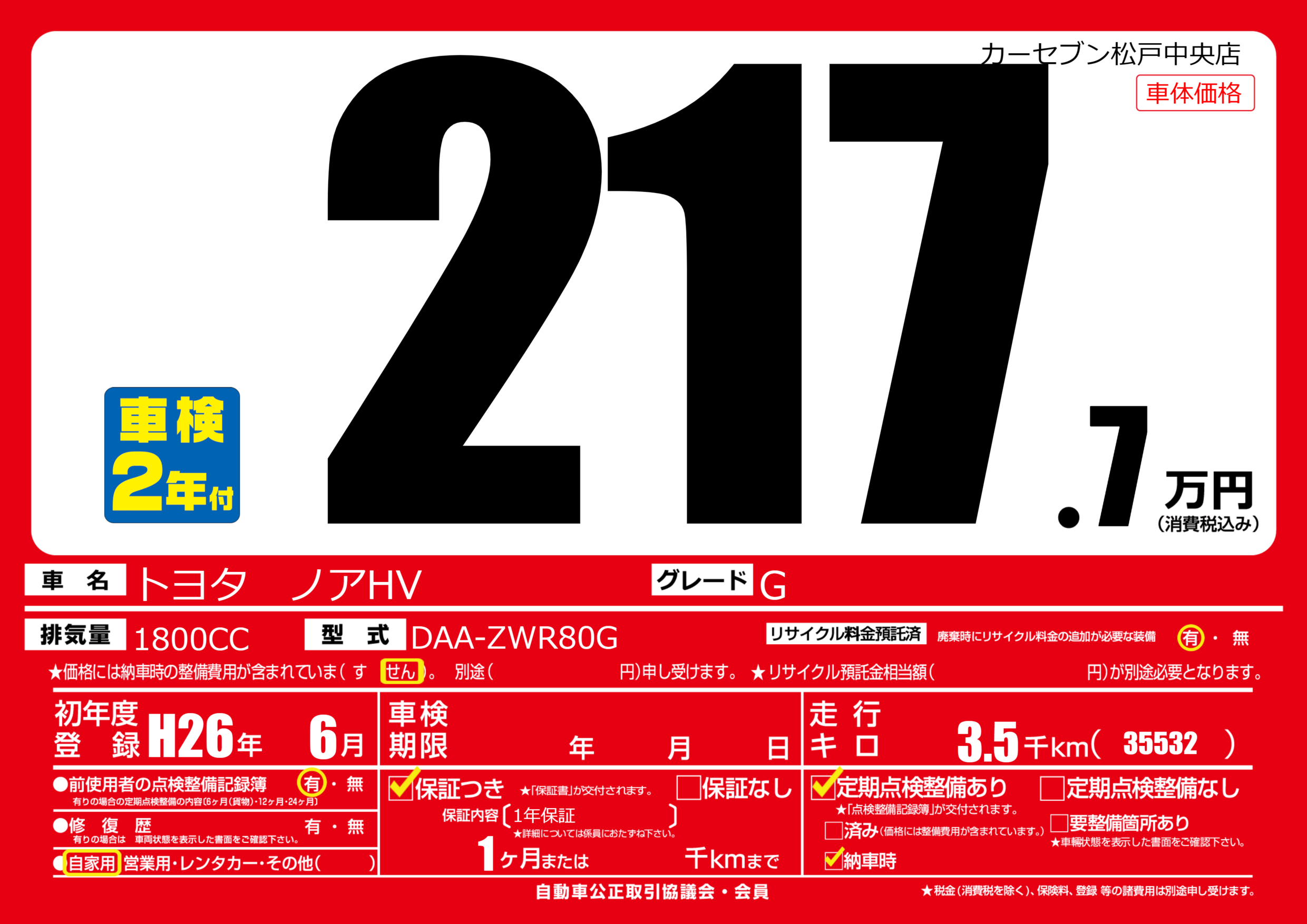 | 車名 | トヨタ ノアHV | グレード ミッション 排気量 |
