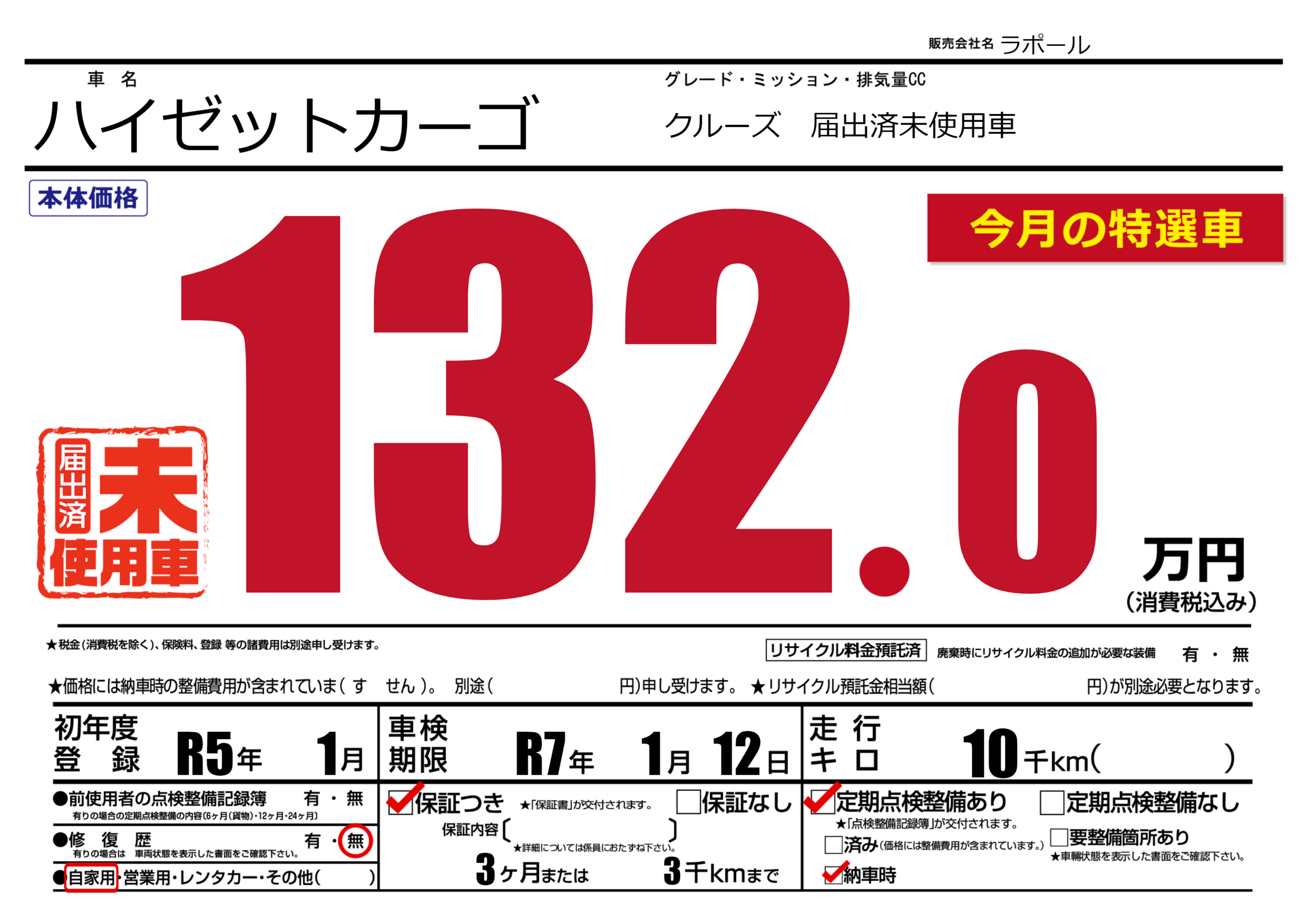 | 車名 | ハイゼットカーゴ | グレード ミッション 排気量 |