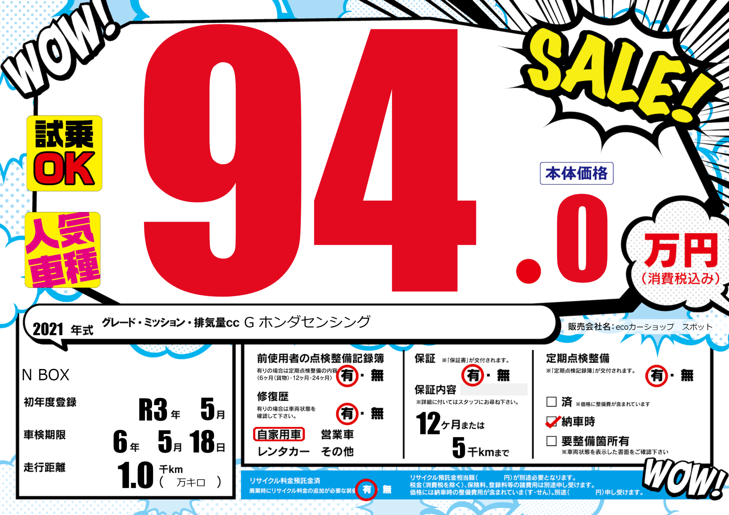| 走行キロ | 0.1万km | 初年度登録 | R3年5月 |