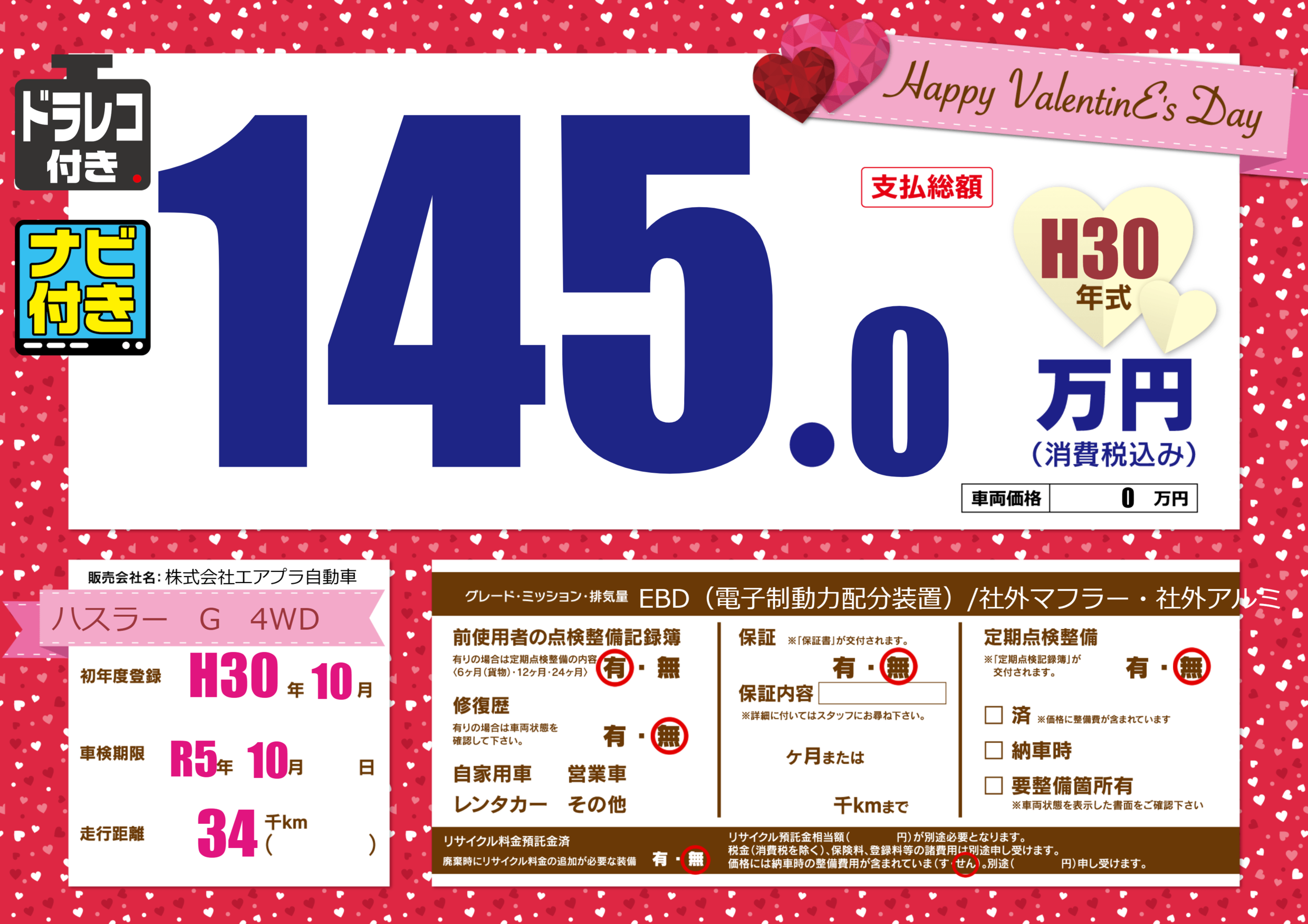 | 走行キロ | 3.4万km | 初年度登録 | H30年10月 |