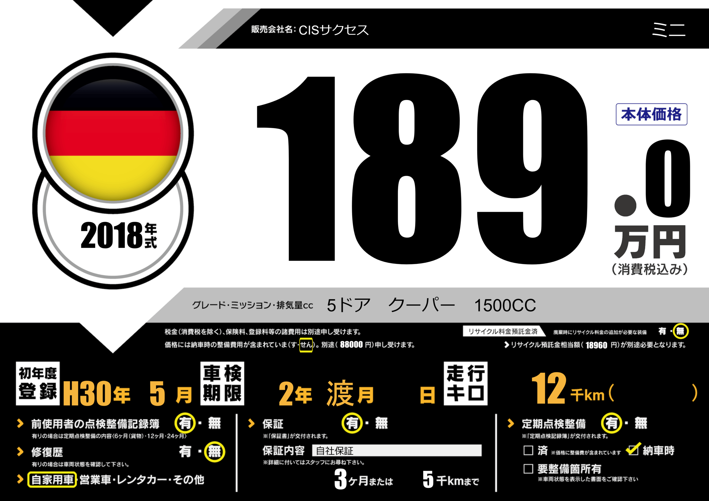 | 車名 | ミニ | グレード ミッション 排気量 |
