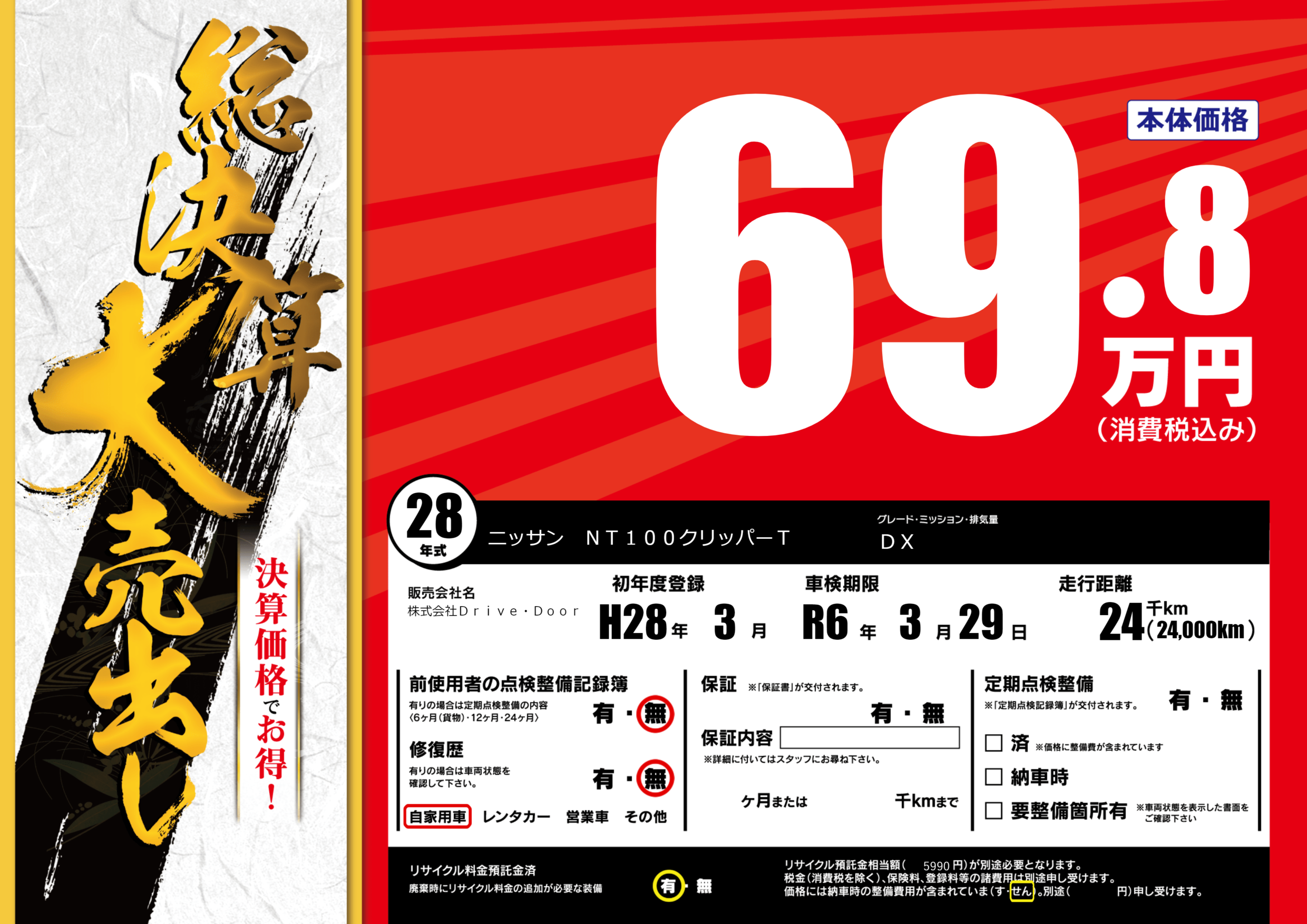 | 車名 | ニッサン NT100クリッパーT | グレード ミッション 排気量 |