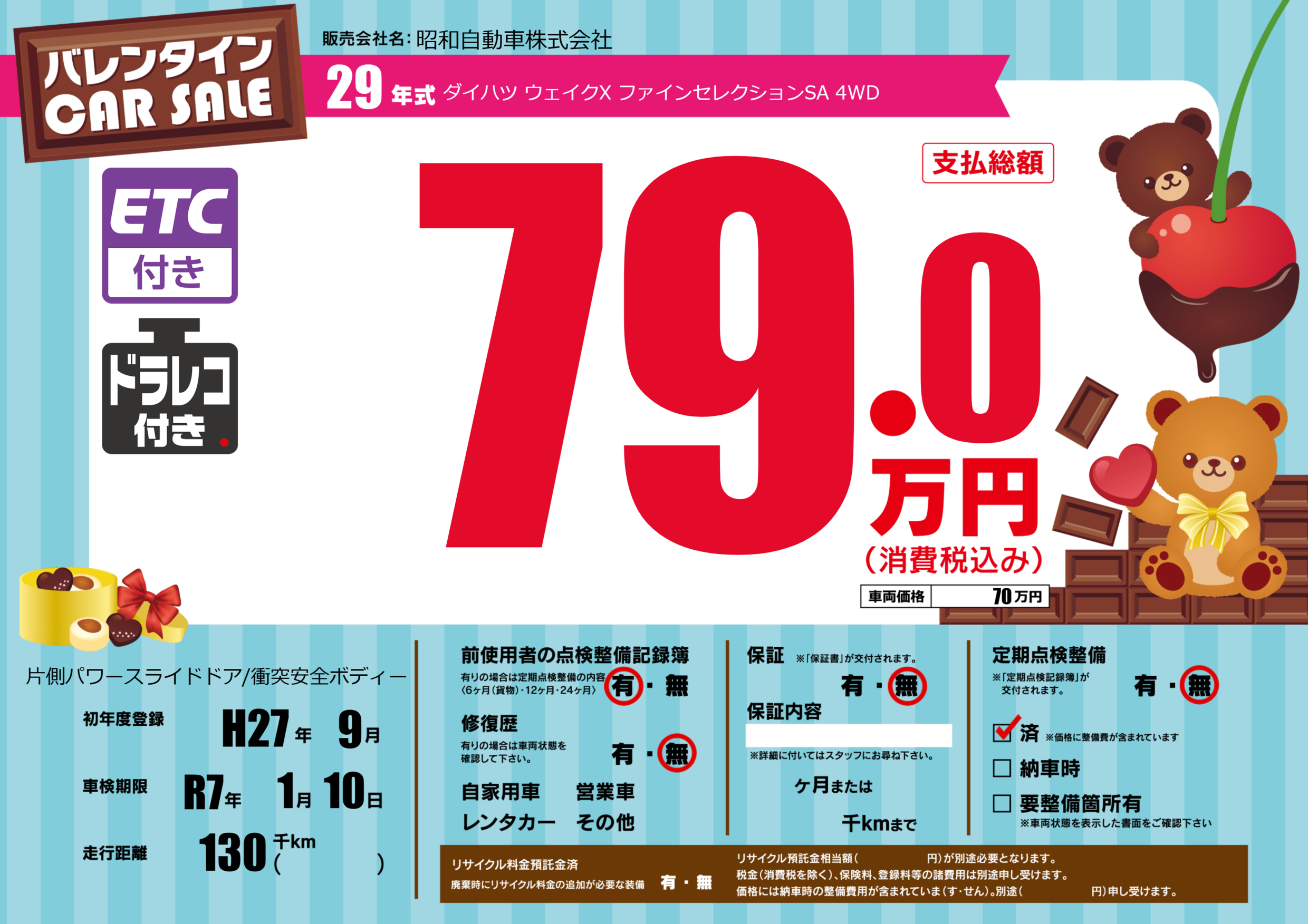 | 車名 | ダイハツ ウェイクX ファインセレクションSA 4WD | グレード ミッション 排気量 |