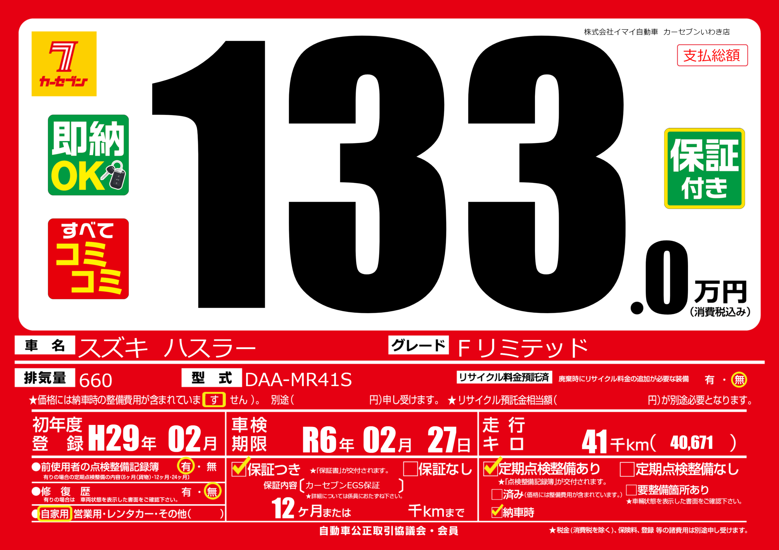 | 走行キロ | 4.1万km | 初年度登録 | H29年02月 |