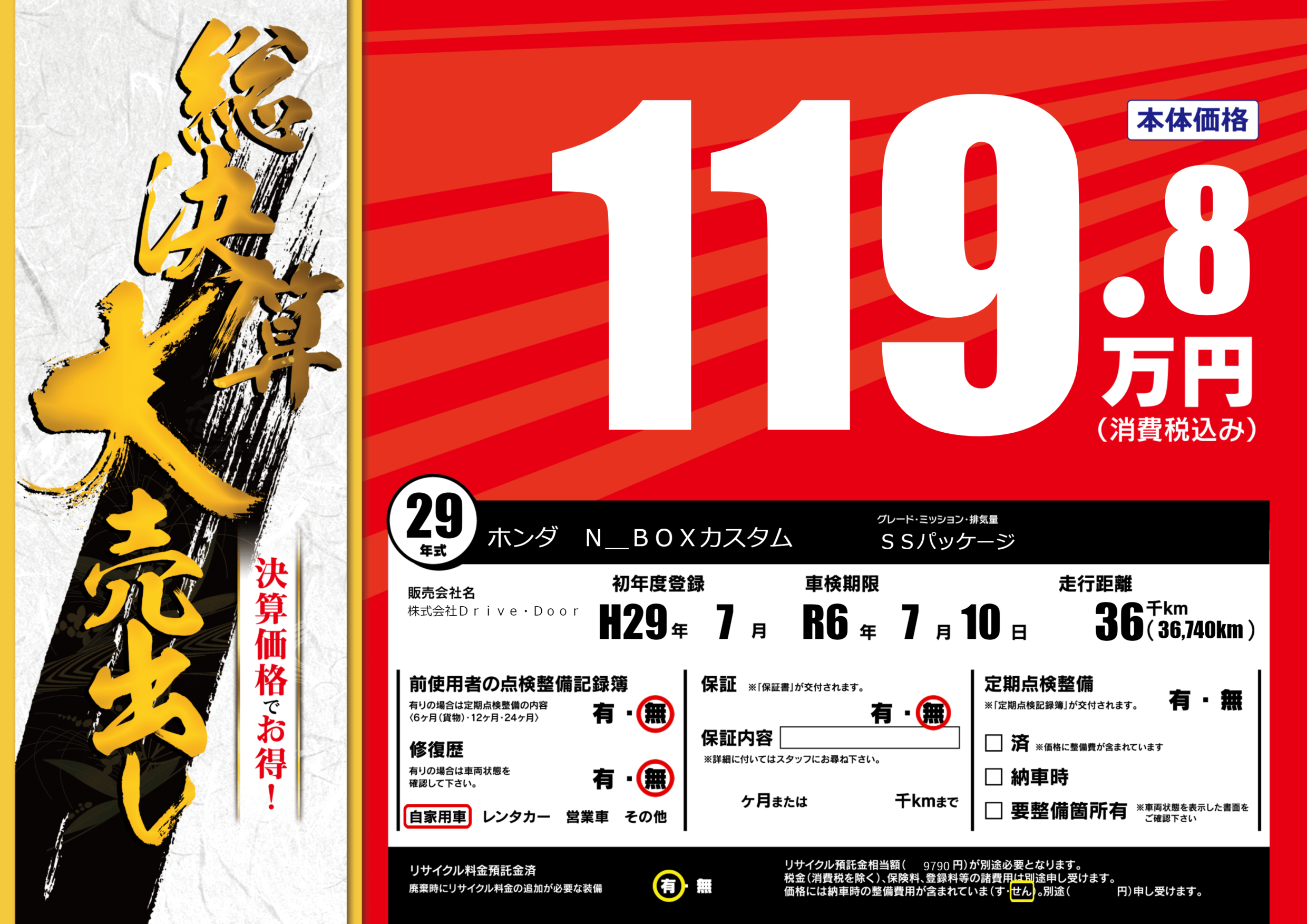 | 走行キロ | 3.6万km | 初年度登録 | H29年7月 |