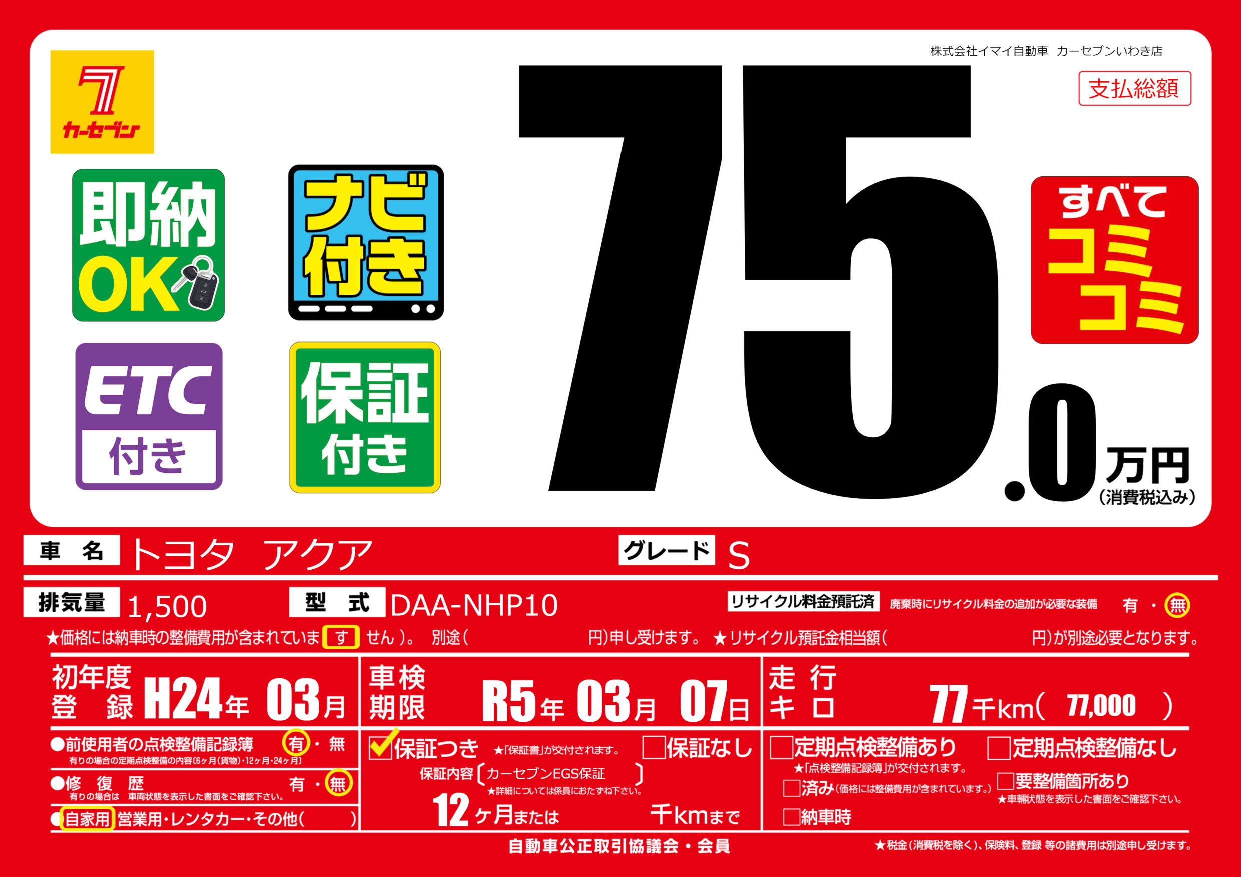 | 走行キロ | 7.7万km | 初年度登録 | H24年03月 |