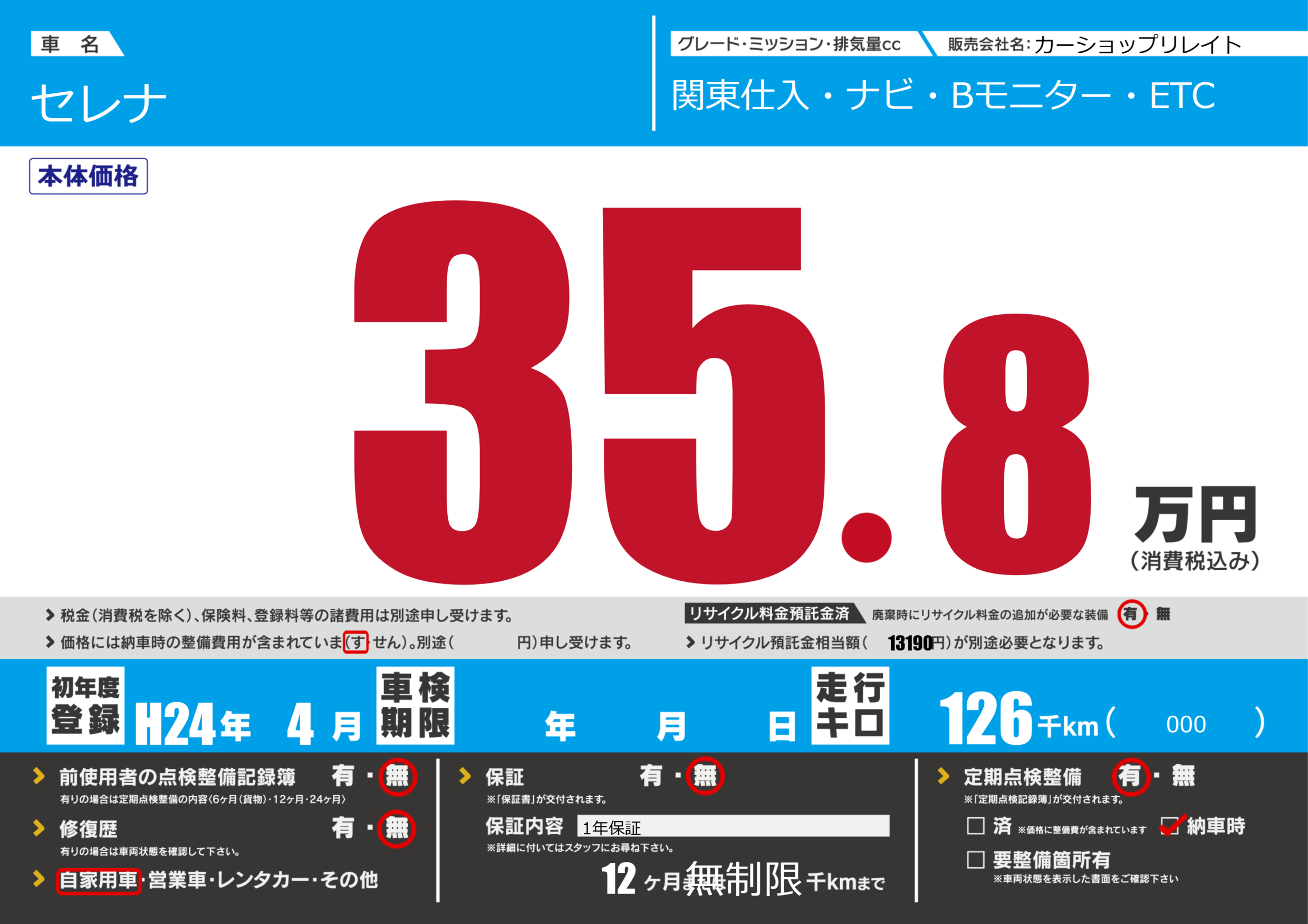 | 走行キロ | 12.6万km | 初年度登録 | H24年4月 |