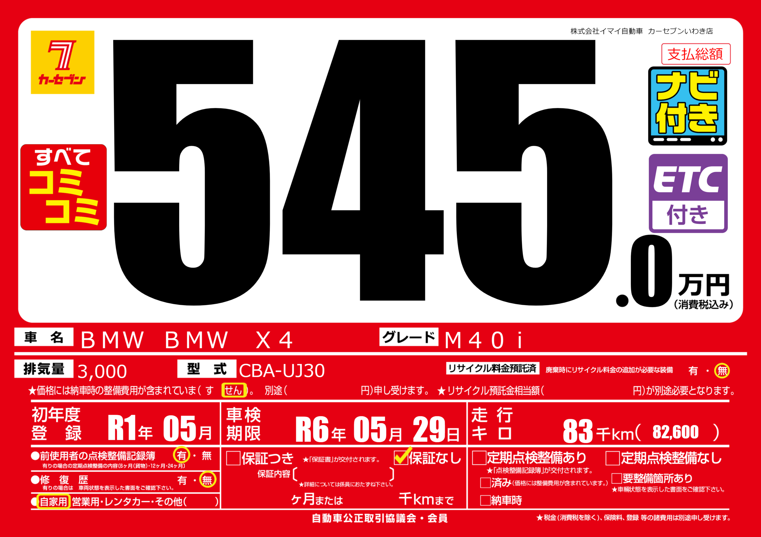 | 車名 | BMW BMW X4 | グレード ミッション 排気量 |