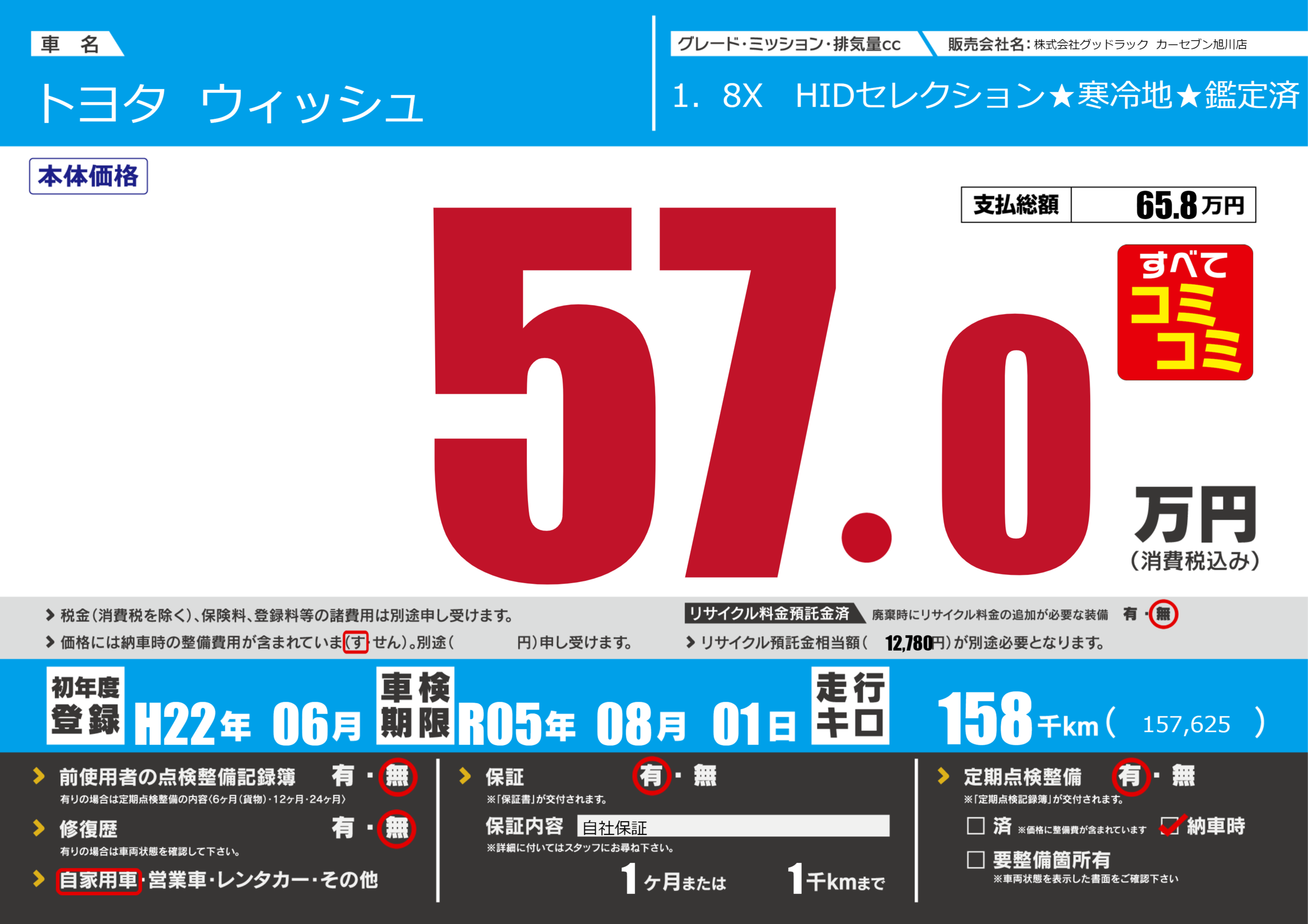 | 走行キロ | 15.8万km | 初年度登録 | H22年06月 |