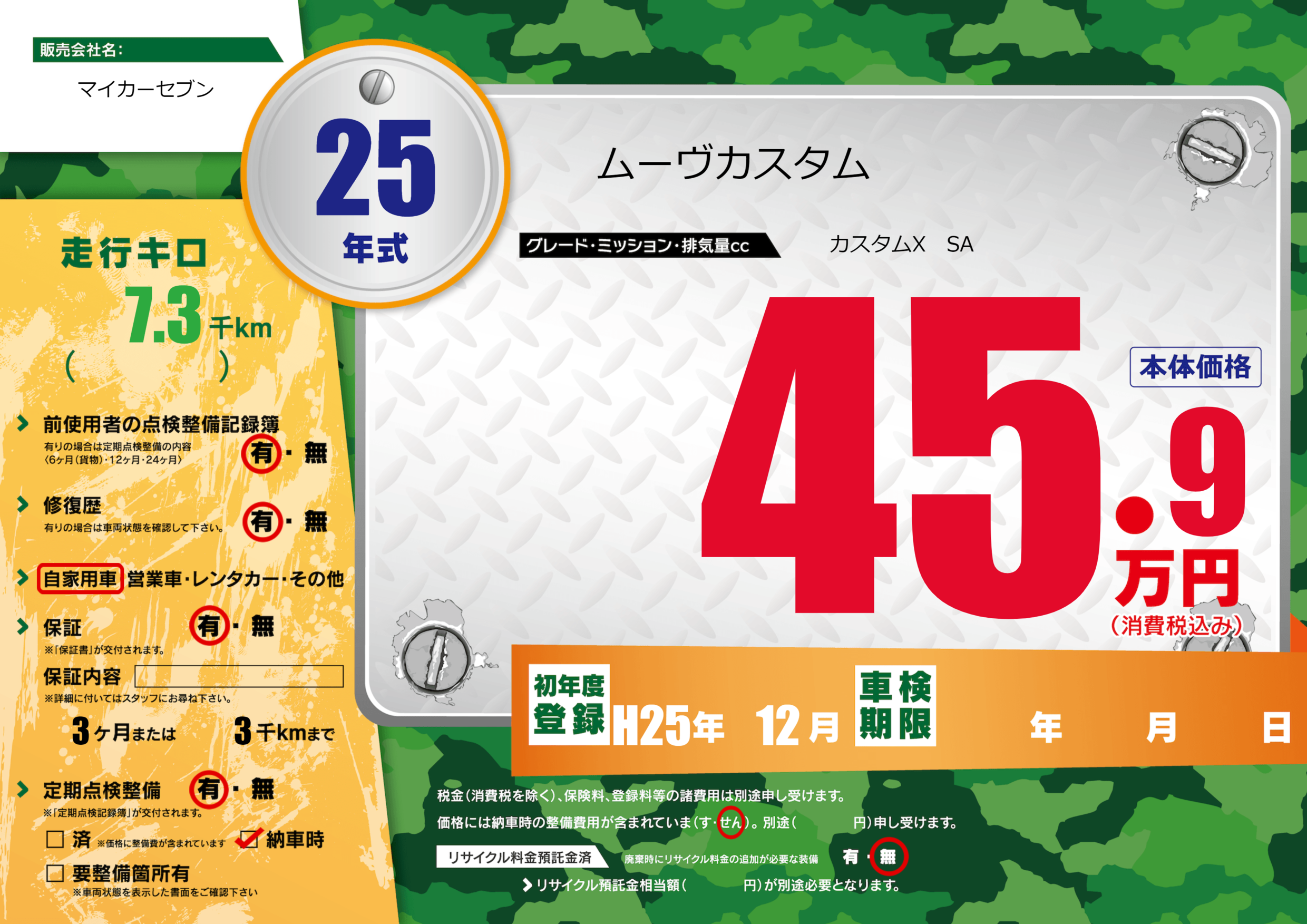 | 定期点検整備 | 定期点検整備あり 納車時あり | ||