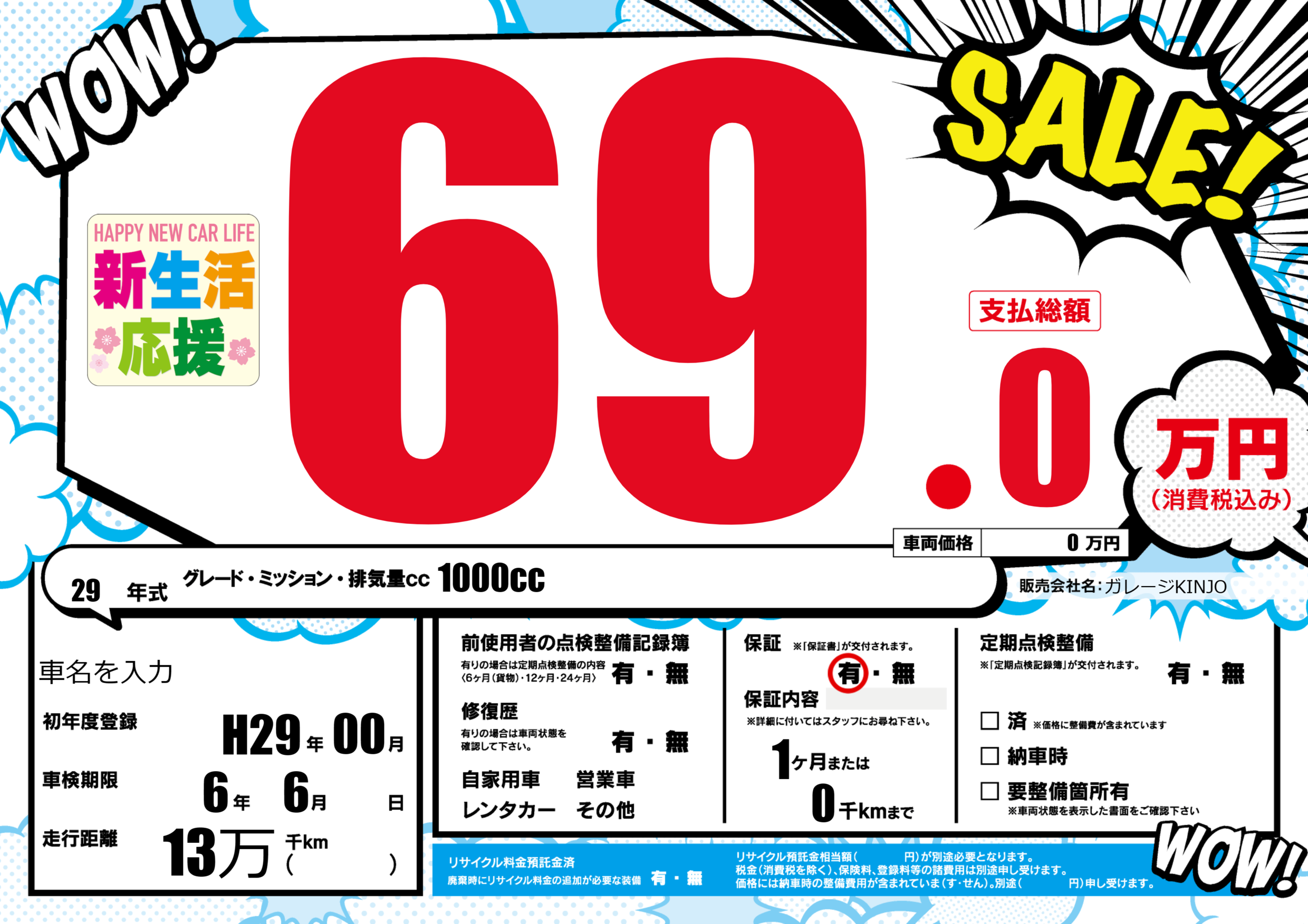 保証付き 保証内容(---) 1ヶ月または(0)千kmまで |