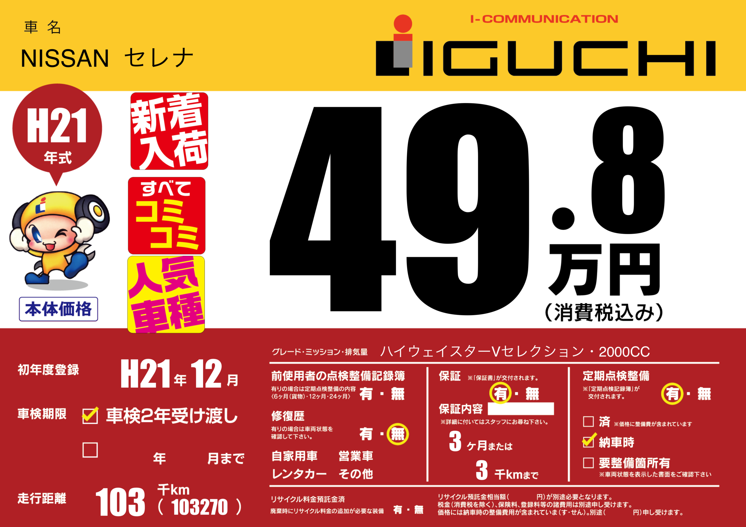 | 車名 | NISSAN セレナ | グレード ミッション 排気量 |
