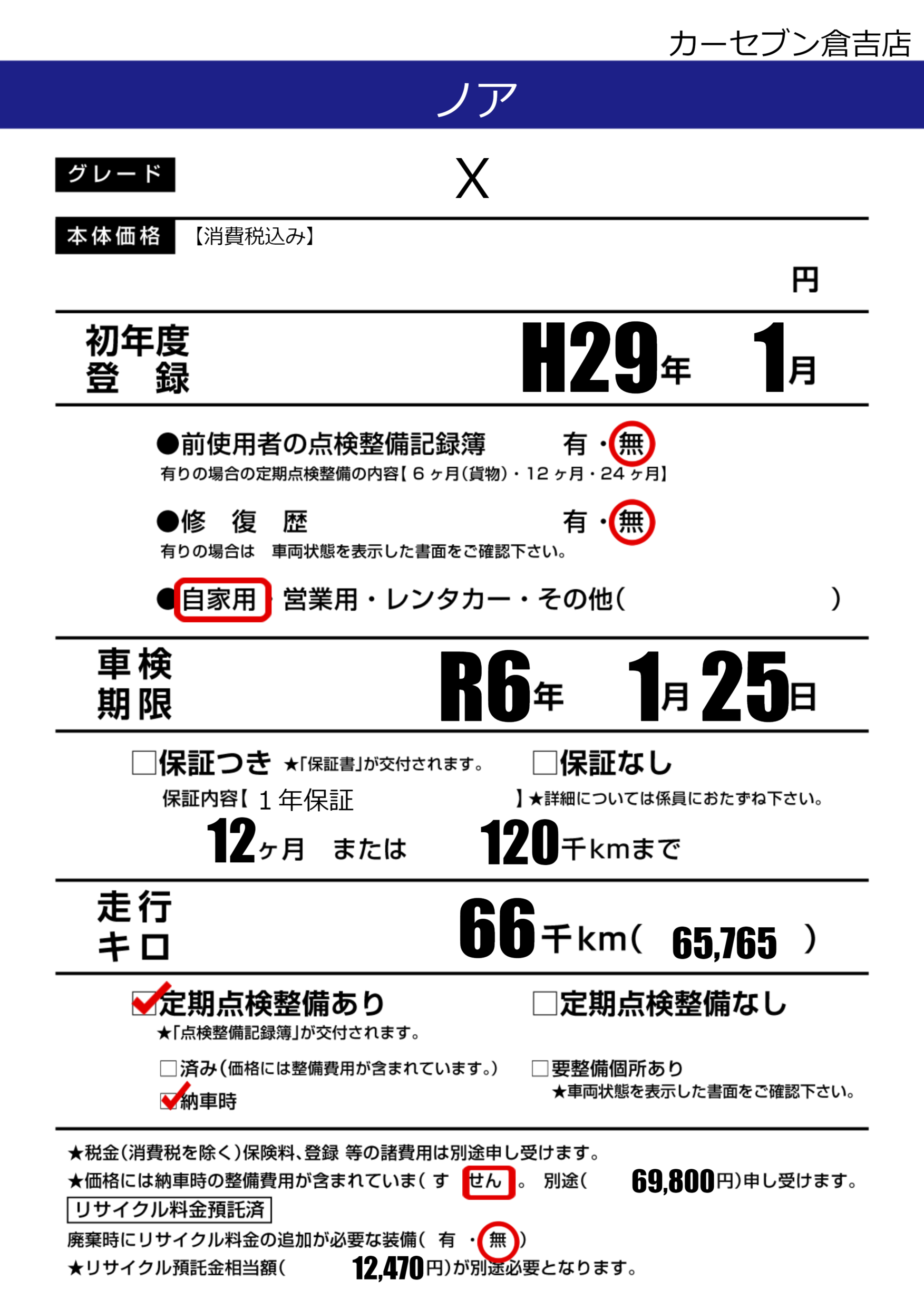 | 定期点検整備 | 定期点検整備あり 納車時あり | ||