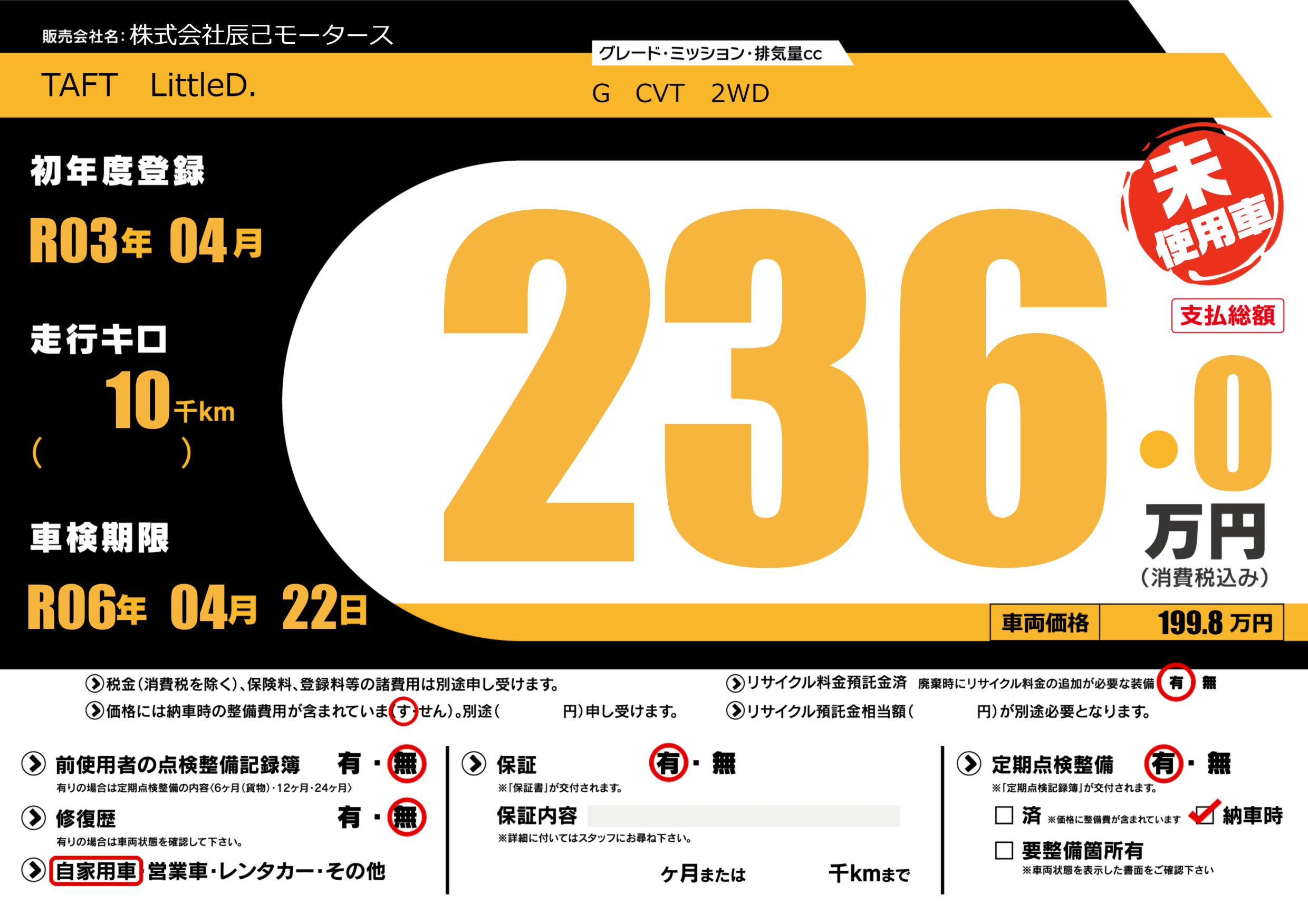 | 車名 | TAFT LittleD. | グレード ミッション 排気量 |