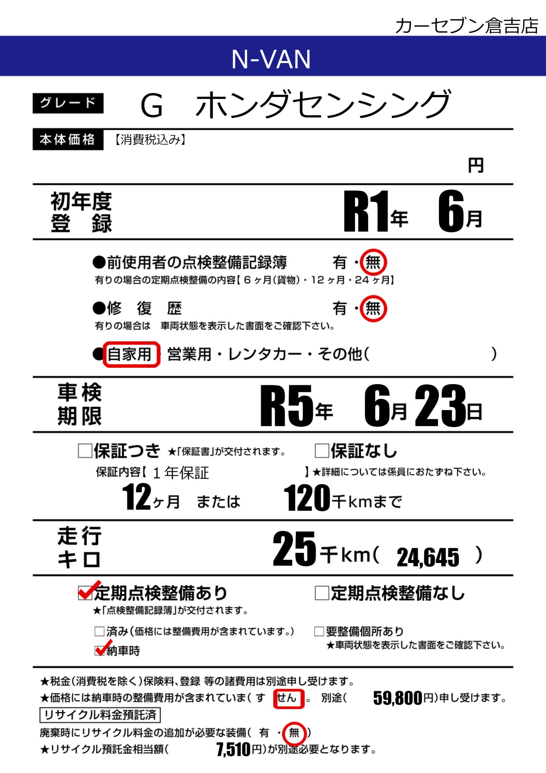 | 車名 | N-VAN | グレード ミッション 排気量 |