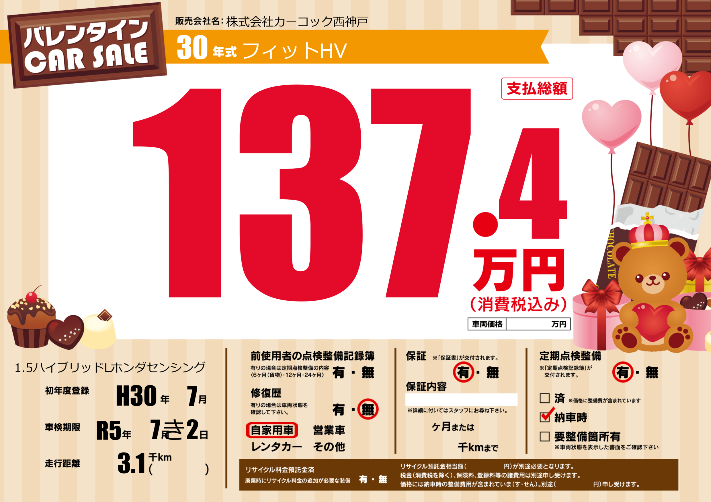 | 走行キロ | 0.3万km | 初年度登録 | H30年7月 |