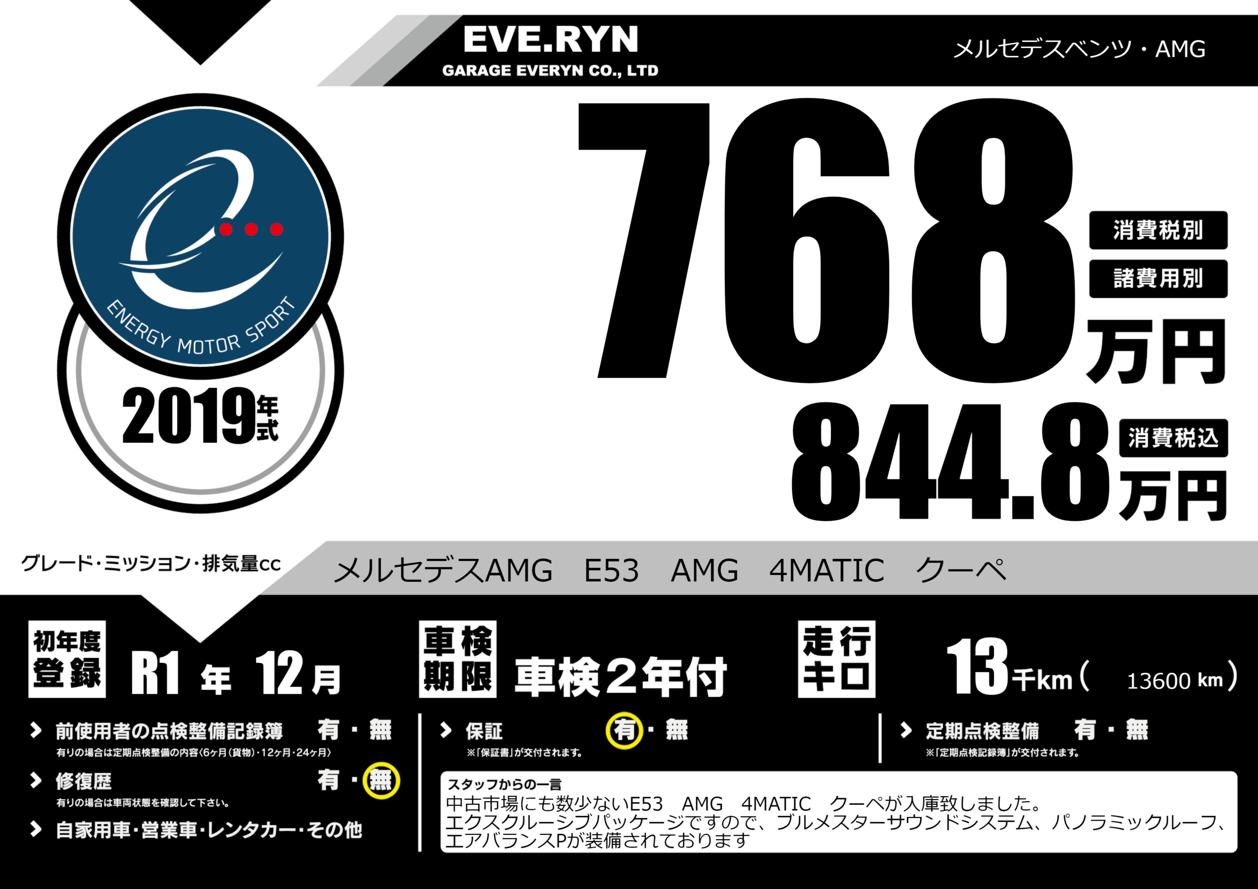 | 走行キロ | 1.3万km | 初年度登録 | R1年12月 |