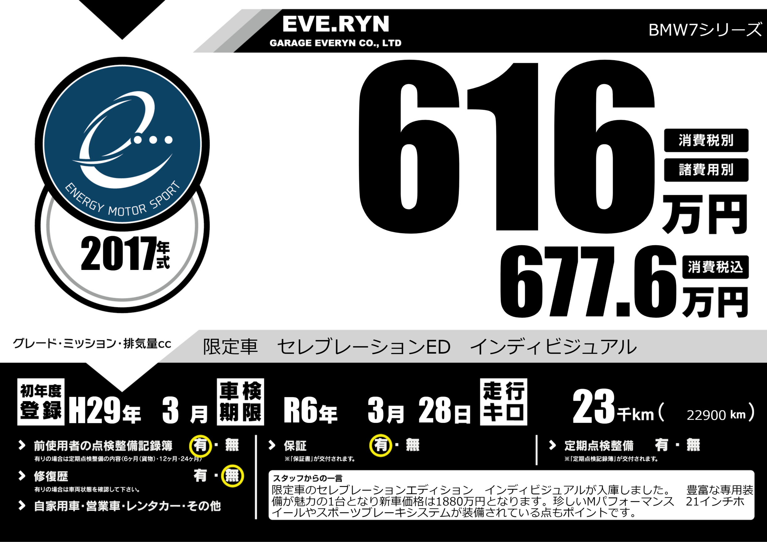 | 車名 | BMW7シリーズ | グレード ミッション 排気量 |