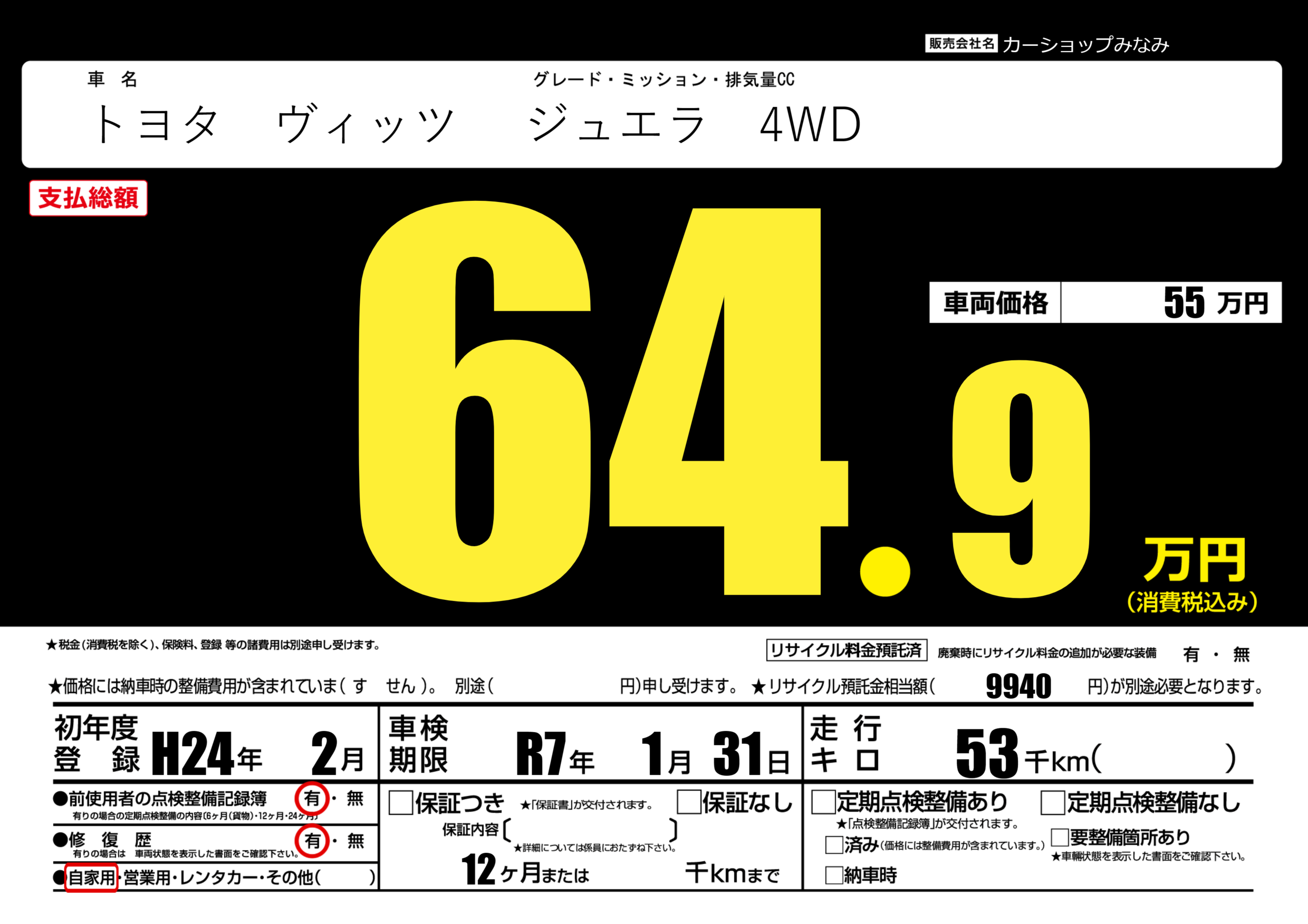 保証なし 保証内容(---) 12ヶ月または()千kmまで |