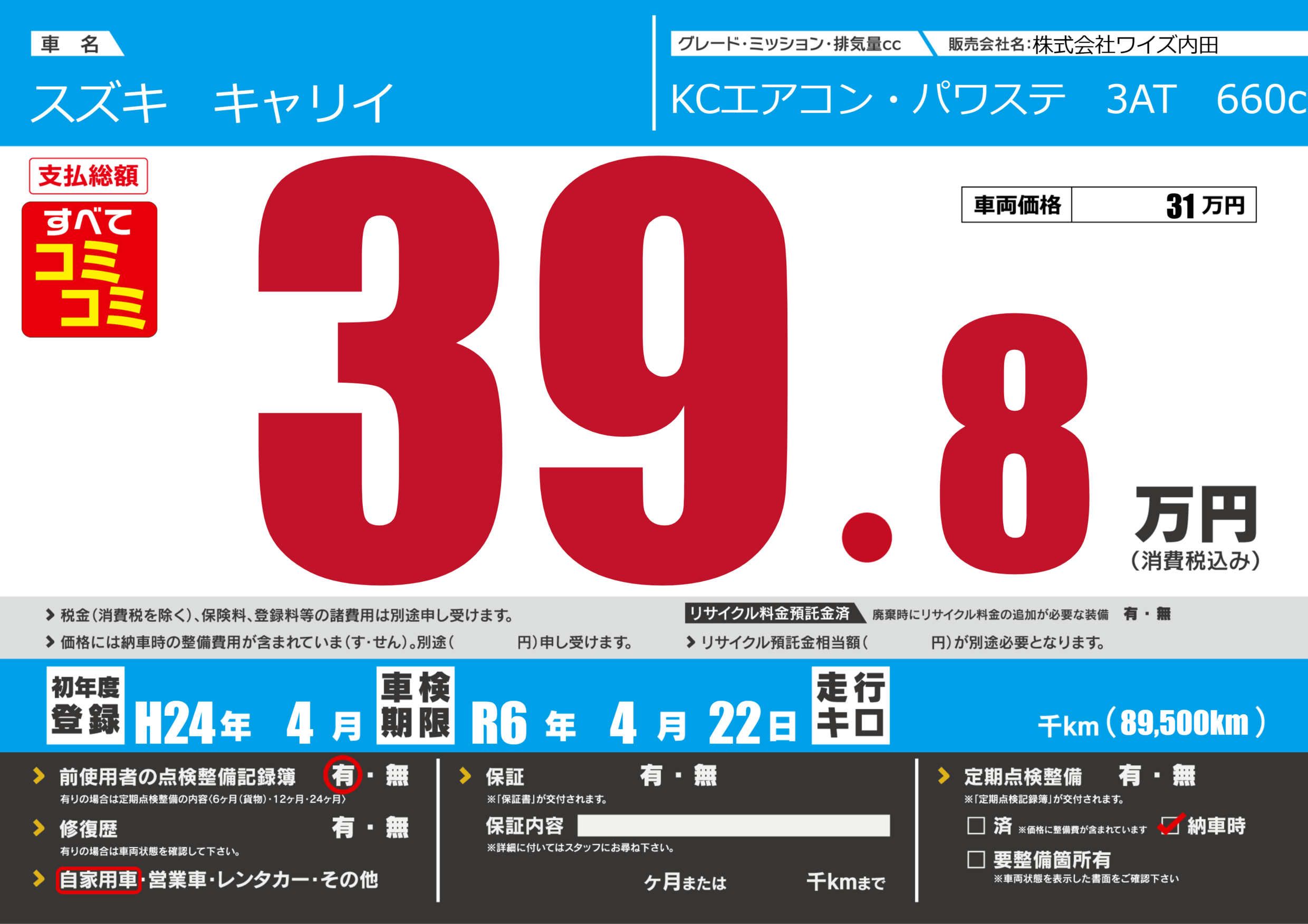 | 車名 | スズキ キャリイ | グレード ミッション 排気量 |
